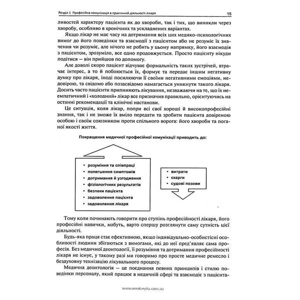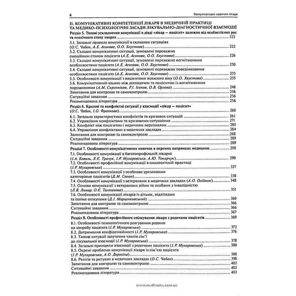 У книзі ґрунтовно розглянуто професійну комунікацію лікаря з пацієнтом, його родиною та колегами, чинники встановлення терапевтичного контакту, тактики взаємодії в складних клінічних ситуаціях, роботу з пацієнтами у стані психічного стресу або з неадаптивною поведінкою. Окрема увага приділена профілактиці й подоланню медичних конфліктів, тайм-менеджменту лікаря, професійному розвитку, психологічній стійкості та запобіганню емоційному вигоранню.