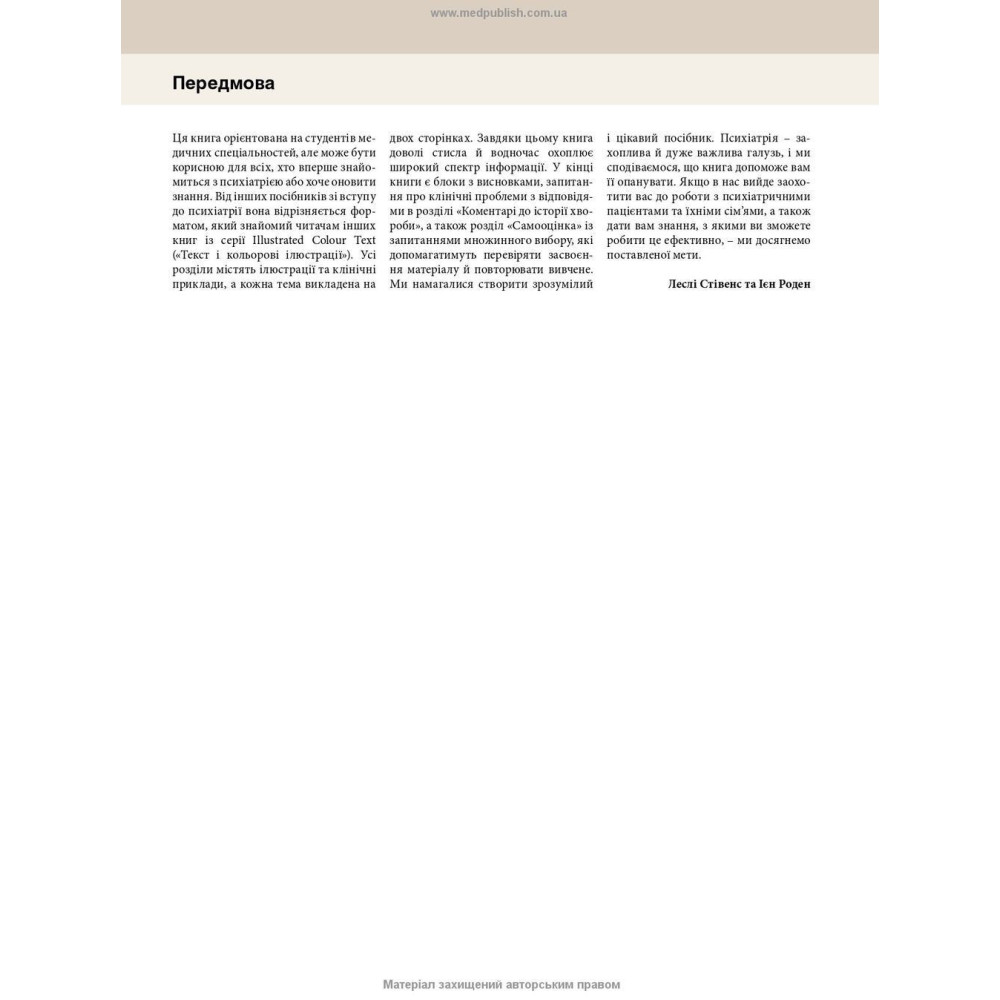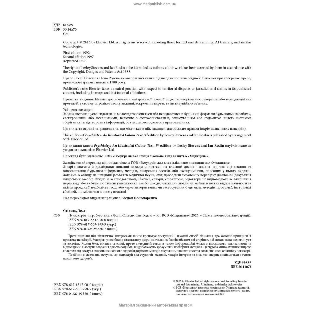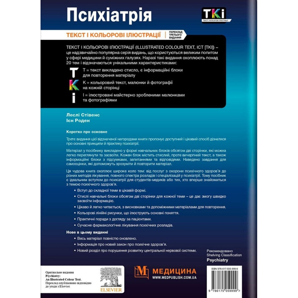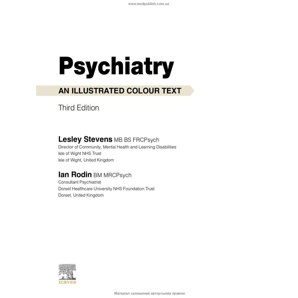 Третє видання відзначеної нагородами книги від Леслі Стівенса та Ієна Родена — «Психіатрія: текст і кольорові ілюстрації» — пропонує доступний і цікавий спосіб дізнатися про основні принципи й практику психіатрії.