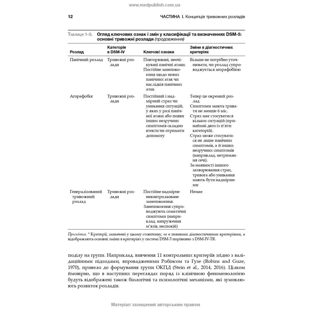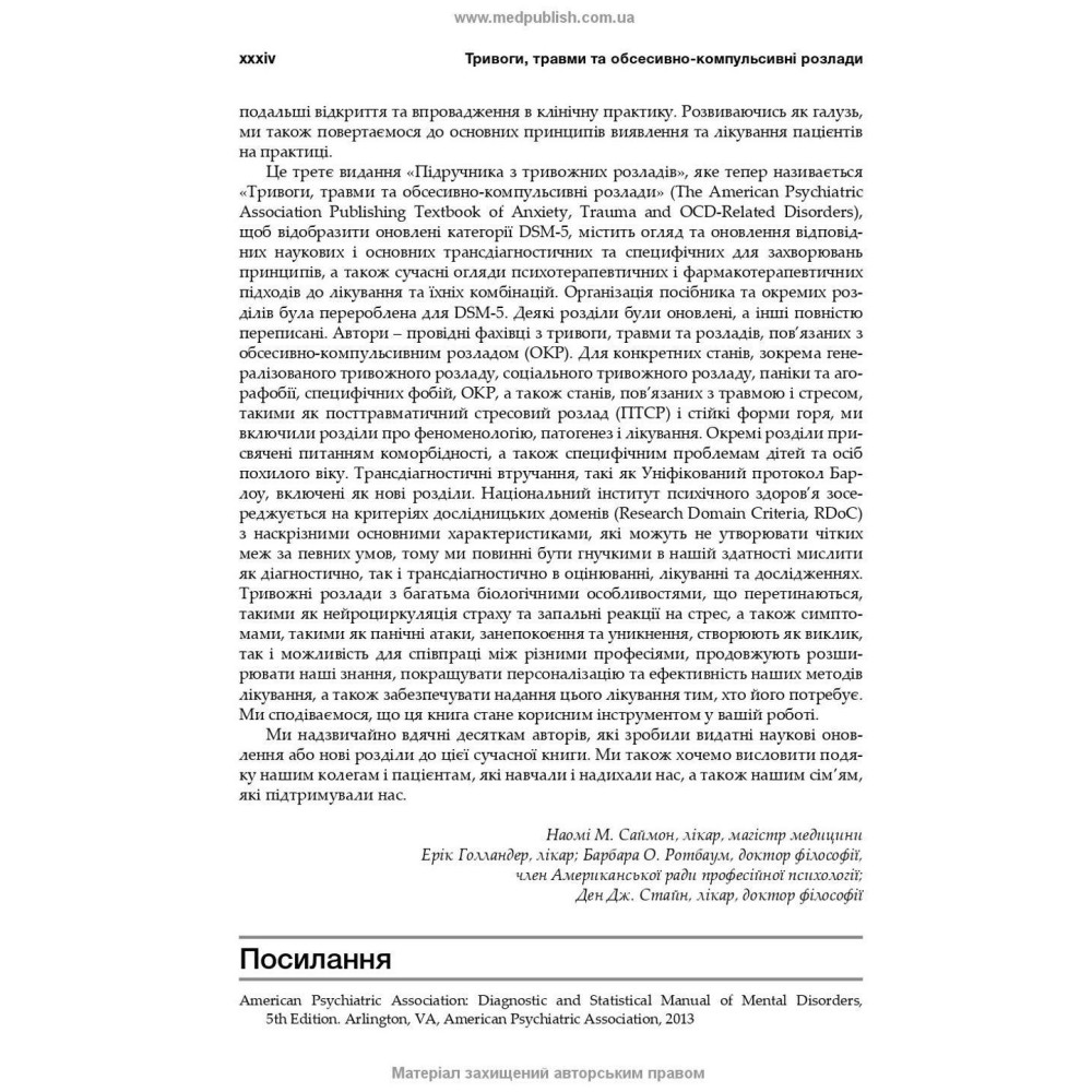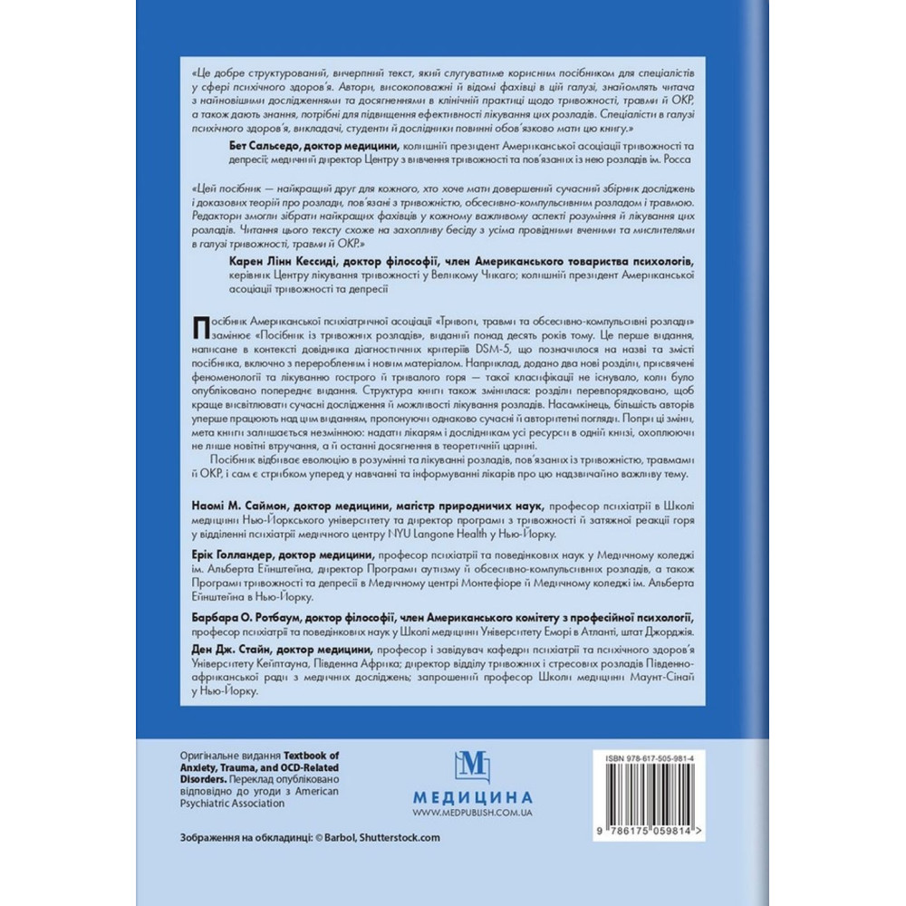 Пропоноване видання «Тривоги, травми та обсесивно-компульсивні розлади: посібник Американської психіатричної асоціації» від Наомі М. Саймон, Еріка Голландера, Барбари О. Ротбаум та Дена Дж. Стайна, написане в контексті довідника діагностичних критеріїв DSM-5, містить огляд і оновлення відповідних наукових та основних трансдіагностичних і специфічних для захворювань принципів, а також сучасні психотерапевтичні й фармакотерапевтичні підходи до лікування.
