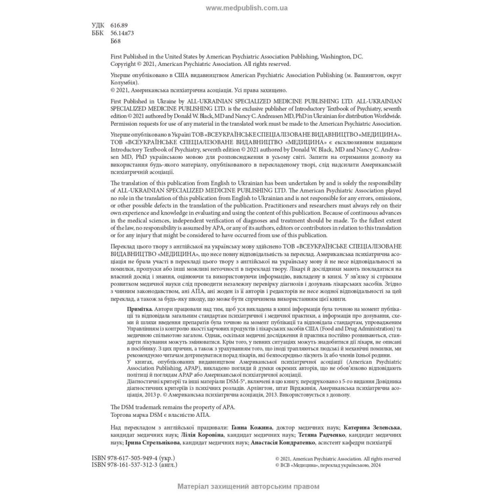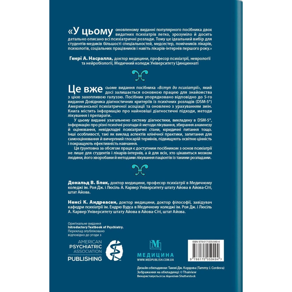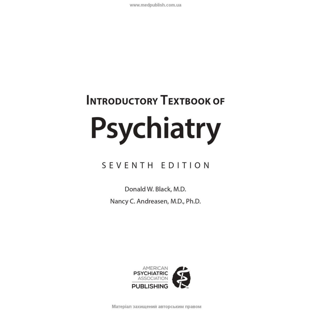 У підручнику «Вступ до психіатрії» за авторством Дональда В. Блека і Ненсі К. Андреасен узагальнено систему діагностики, викладену в DSM-5®, інформацію про різні психічні розлади й методи лікування, збирання анамнезу й оцінювання, невідкладні психіатричні стани, юридичні питання тощо. Інші особливості, такі як виклад аспектів клінічної практики, запитання для самооцінювання й вичерпний глосарій термінів, підвищують освітню цінність і покращують ефективність навчання.