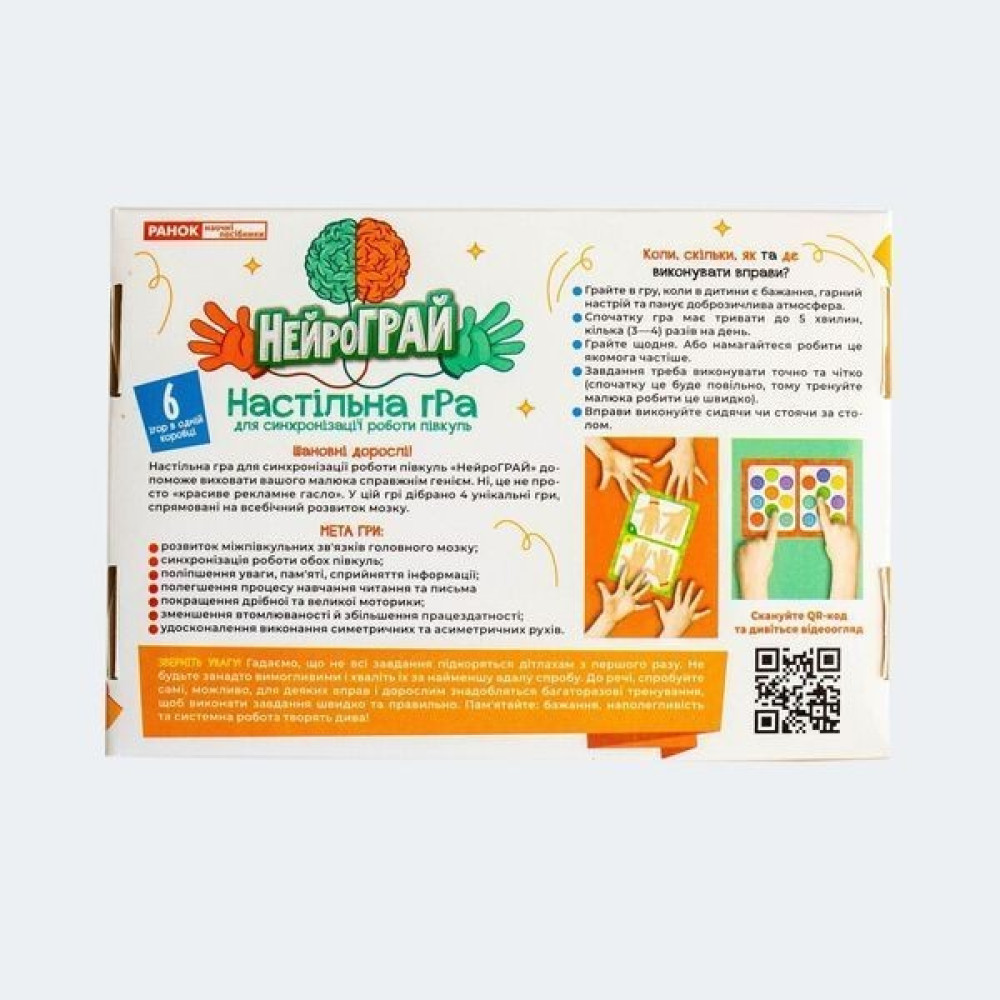 Настільна гра для синхронізації роботи півкуль «НейроГрай» — це гра, яка не тільки розважає, а й розвиває. Готує до навчання. Надихає. І поступово — день за днем — формує звичку вчитись із задоволенням.
