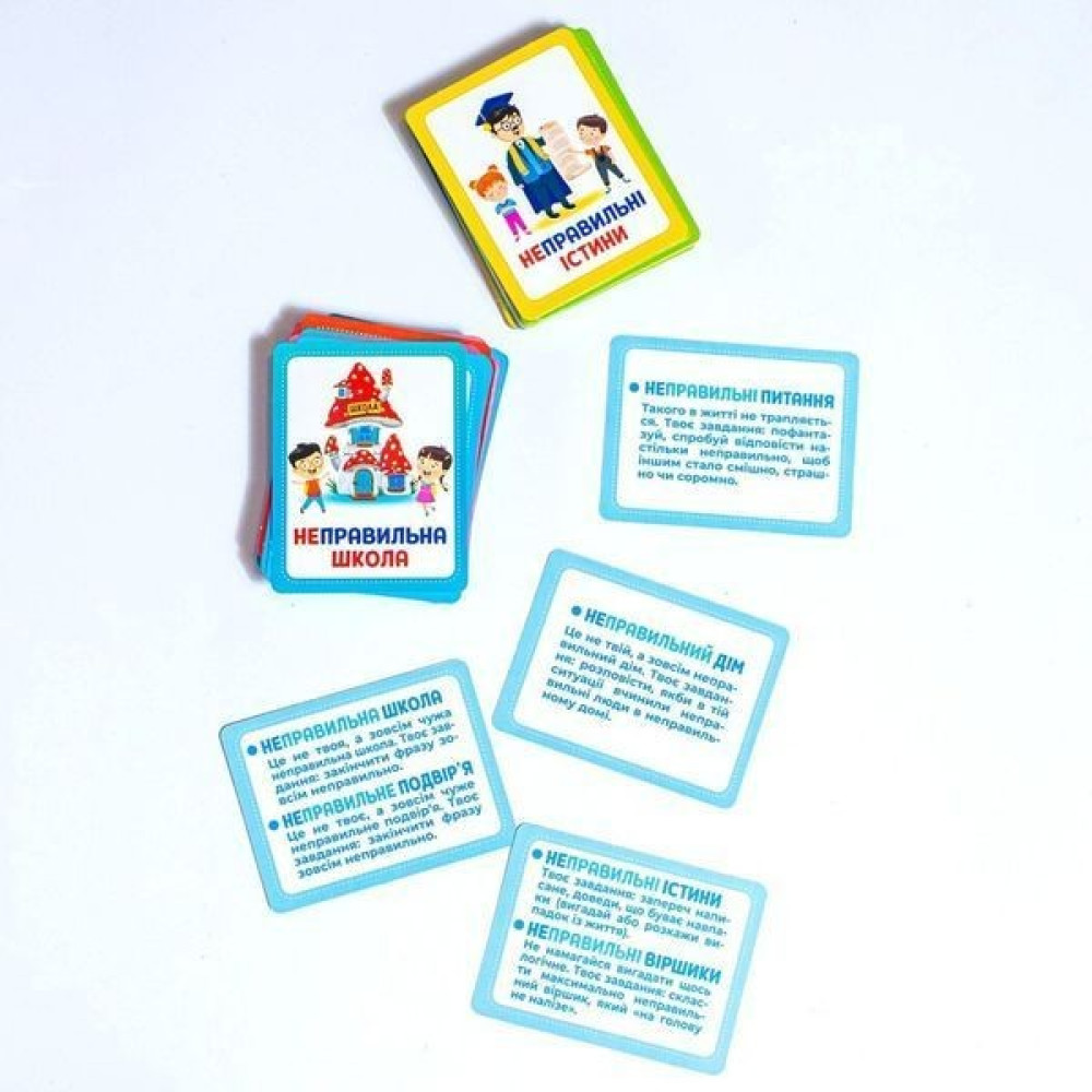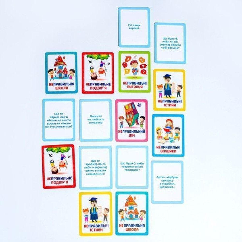 Містить аж 6 категорій карток, які охоплюють різні сфери життя дитини та дорослого: неправильна школа, неправильне подвір’я, неправильний дім, неправильні питання, неправильні віршики, неправильні істини.