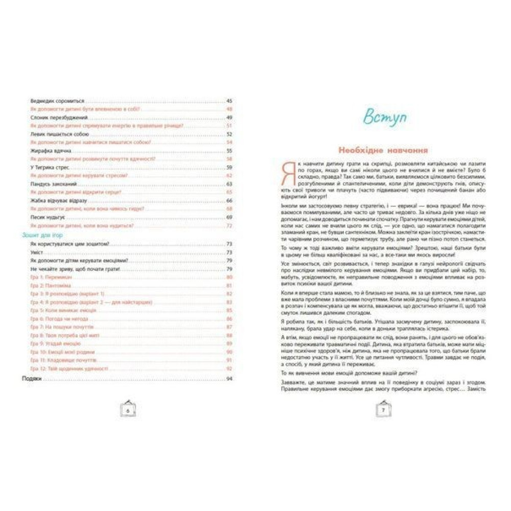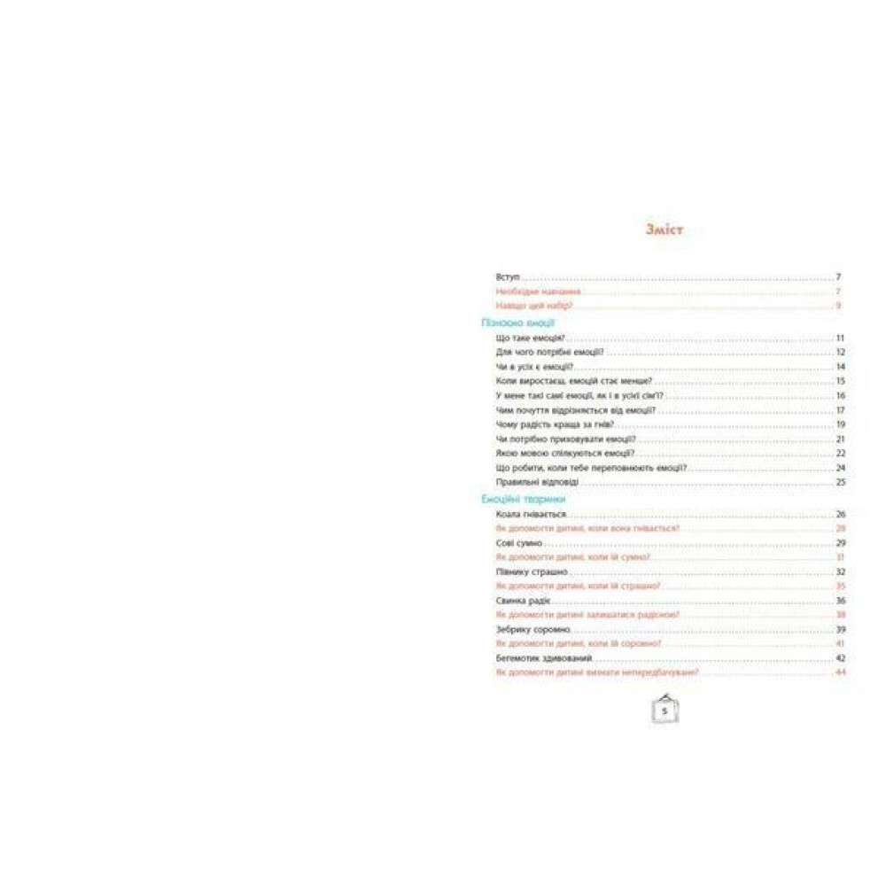 Зебрик, коала, свинка, півник та інші персонажі допоможуть дитині осягнути свої емоції, навчитися ділитися ними, а отже розрядити їх до того, як вони вибухнуть і захлеснуть дитину. Ноемі де Сен-Сернен, популярна авторка й фахівець в галузі особистісного розвитку, пропонує комплект з 59 карток з тваринками й карти зі шкалою, до яких додається книжка з детальними інструкціями, як користуватися комплектом.