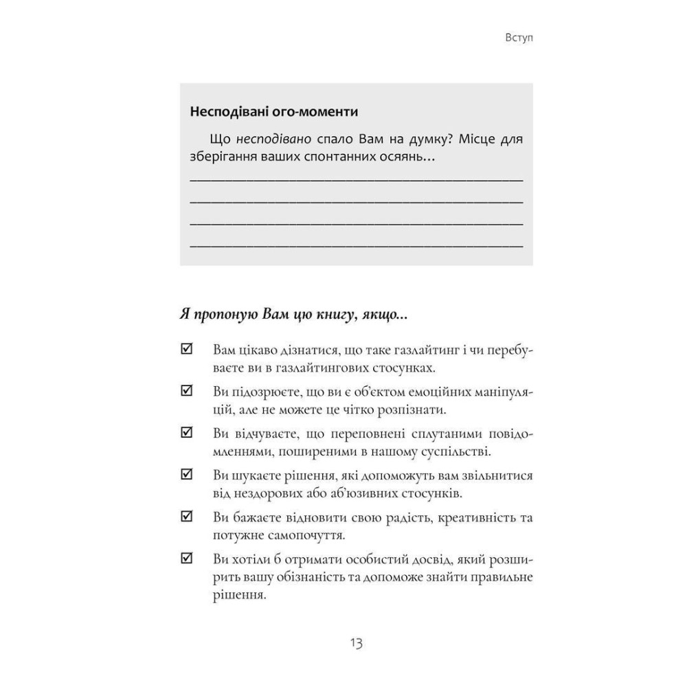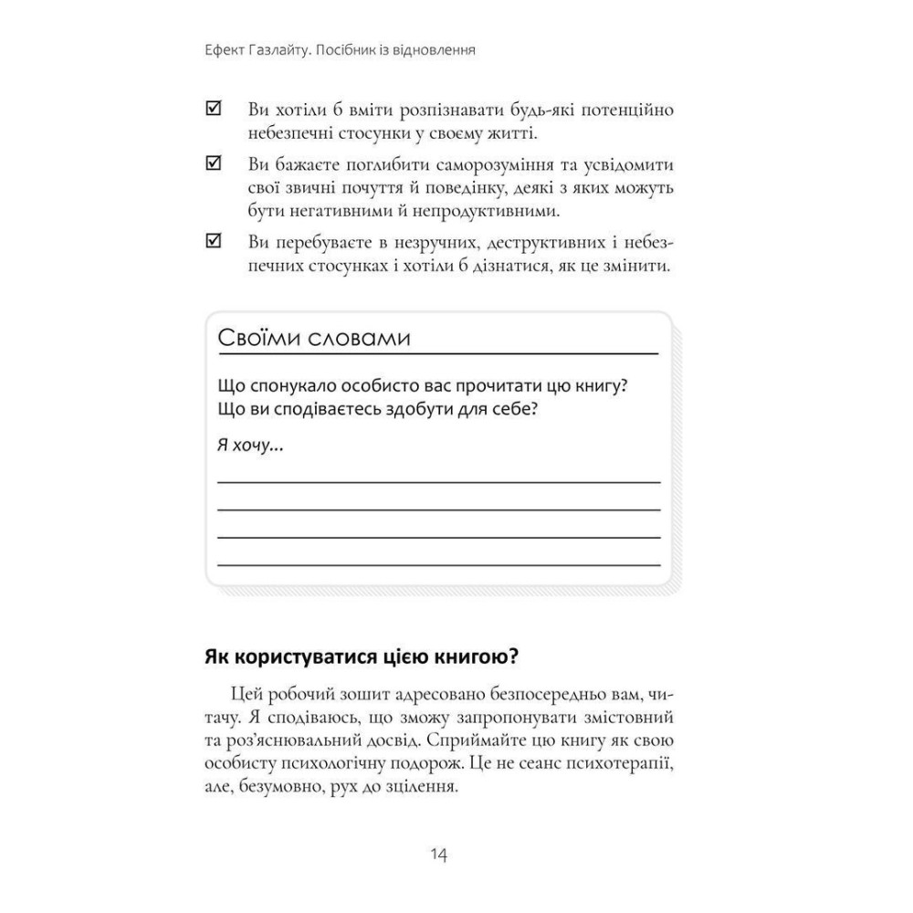 Цей робочий зошит містить допоміжну методику та засоби зцілення, які надають можливість для саморозкриття, глибшого розуміння власної динаміки та насамперед — чіткий шлях до одужання. Зцілення від аб'юзивних стосунків — завдання складне, проте необхідне, якщо є бажання рухатися вперед та відновлювати власне життя.