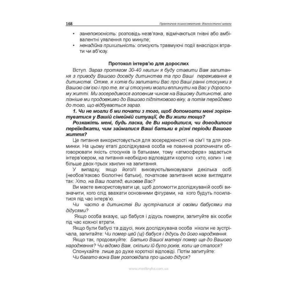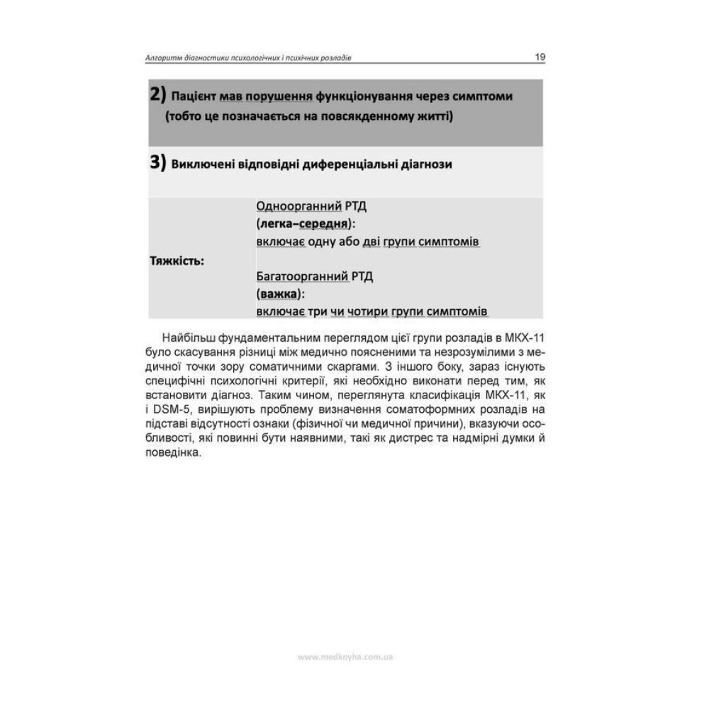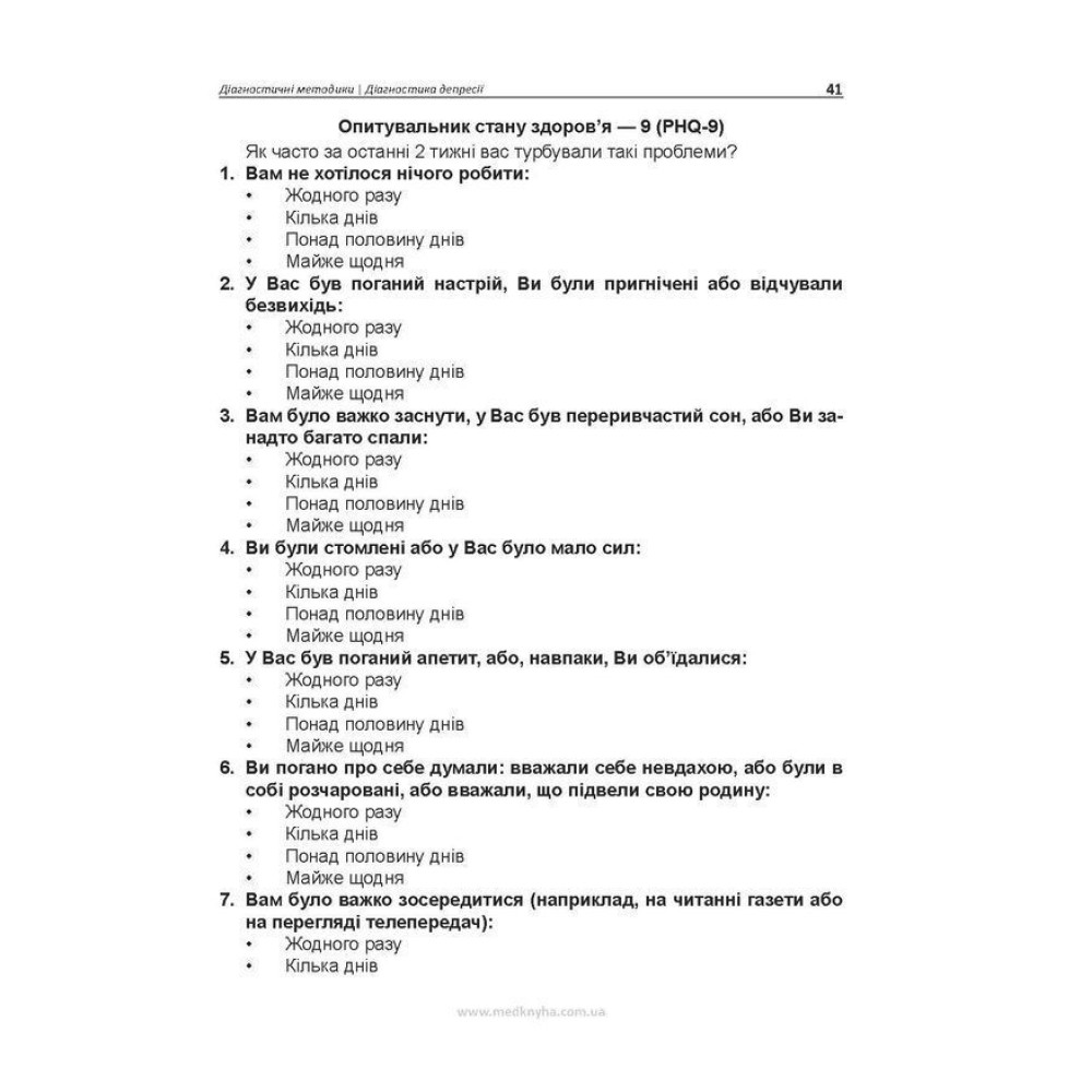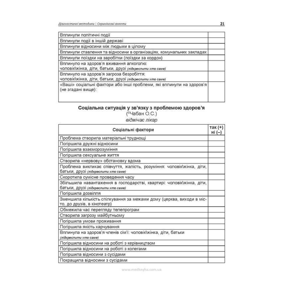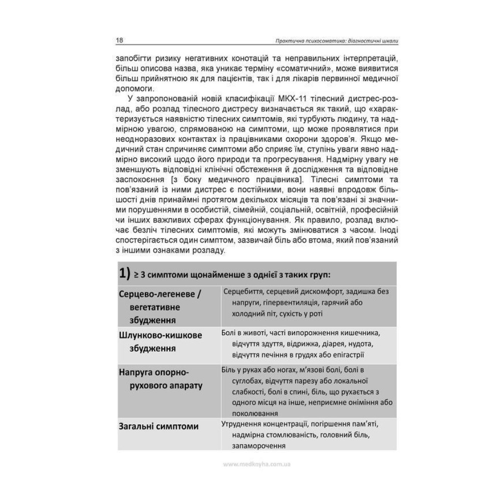 Представлено також оцінку життєстійкості та потреб у реабілітації; надано шкали для визначення тривоги та депресії в постінсультних пацієнтів із вадами комунікації. Представлено методи визначення якості життя психосоматичних пацієнтів, у тому числі, розроблені авторами посібника. Окремий підрозділ присвячено діагностиці синдрому емоційного вигоряння. Наведені матеріали дозволяють провести всебічну оцінку основних психопатологічних феноменів задля обґрунтованої подальшої розробки стратегії і тактики комплексної терапії.