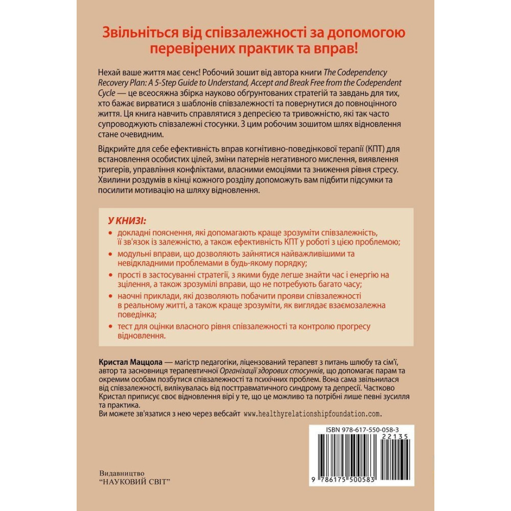 Робочий зошит вiд Кристал Маццоли «Співзалежність: робочий зошит. Прості вправи для здобуття та підтримки власної незалежності» — це всеосяжна збiрка науково обгрунтованих стратегiй та завдань для тих, хто бажає вирватися з шаблонiв спiвзалежностi та повернутися до повноцiнного життя. Ця книга навчить справлятися з депресiєю та тривожнiстю, якi так часто супроводжують спiвзалежнi стосунки. 3 цим робочим зошитом шлях вiдновлення стане очевидним.