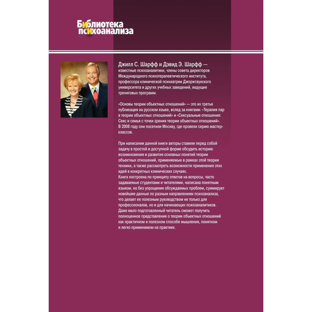 На сторінках книги «Основы теории объектных отношений» відомі експерти в галузі теорії та практики терапії об'єктних відносин Девід Е. та Джіл С. Шарфи відповідають на запитання, пов'язані з цим стрімко розвиваючим напрямком. Розглядаються історія формування, основні положення та поняття теорії об'єктних відносин, можливості його інтеграції з іншими підходами, розглядаються варіанти його застосування в рамках індивідуальної, групової, сімейної та сімейної терапії. Аналізуються явища передачі та протистояння, фрейдистська теорія, теорія прихильності, теорія хаосу. Наведені конкретні приклади, які ілюструють як теоретичні, так і практичні аспекти застосування теорії об'єктних відносин. Пропонуються різні моделі, методи та методи психотерапевтичної роботи.