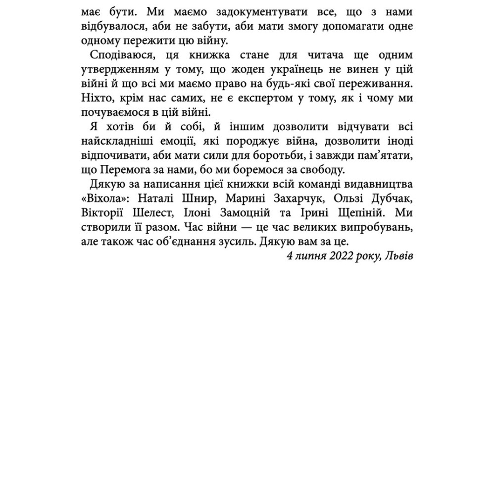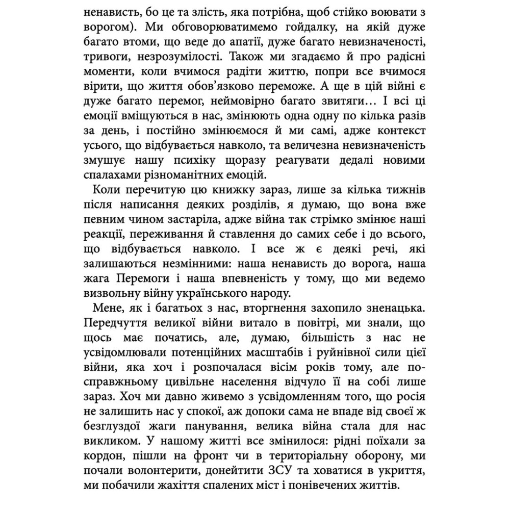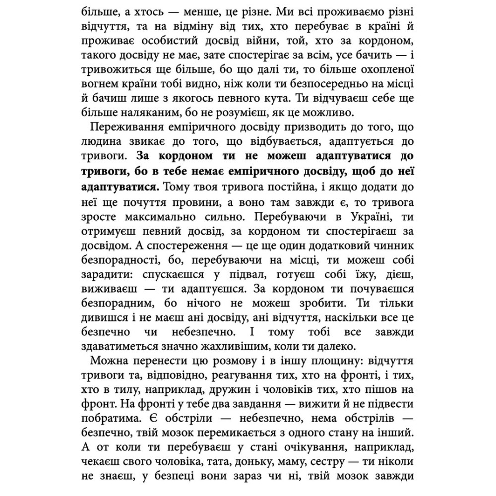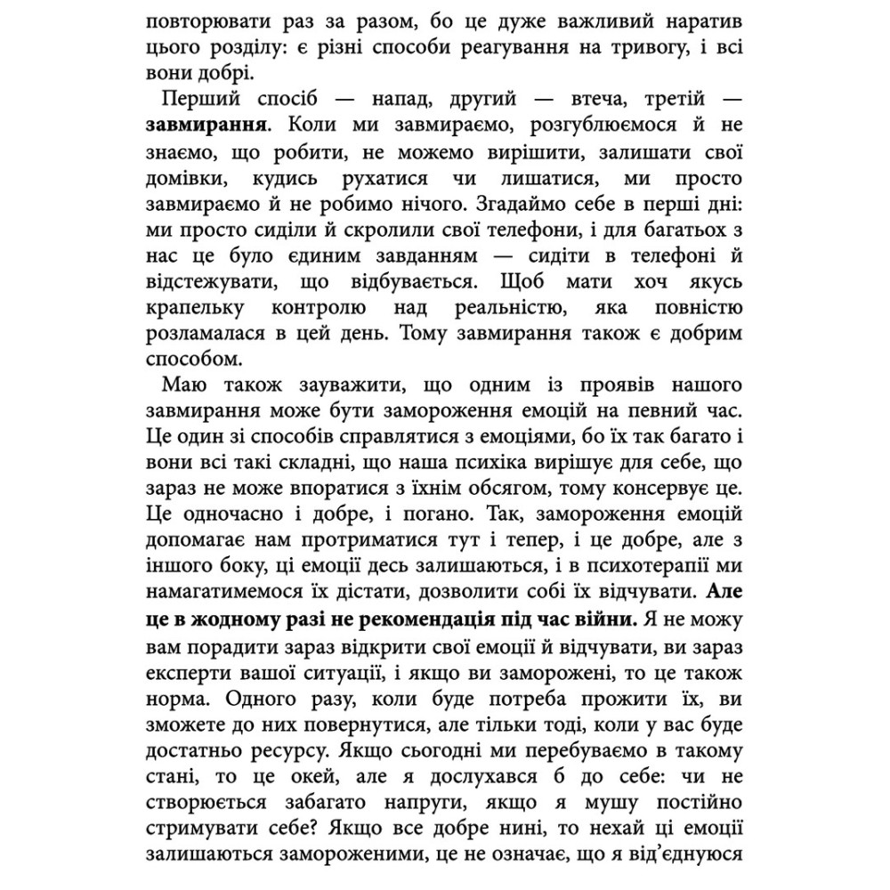 Будь-яка емоційна реакція є нормальною відповіддю на ненормальні обставини війни, стверджує психотерапевт. Ми маємо право відчувати лють, маємо право хотіти помсти, ми можемо вмикати чорно-біле мислення і не відчувати при цьому провини. Ми можемо сумувати, ми можемо плакати стільки, скільки потрібно.