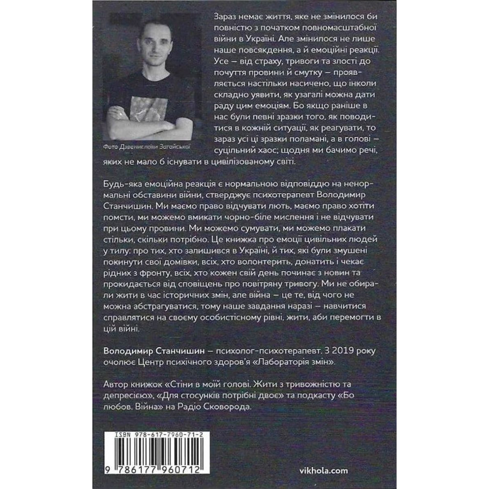 Володимир Станчишин, автор книги «Емоційні гойдалки війни. Роздуми психотерапевта про війну» певен, що зараз немає життя, яке не змінилося би повністю з початком повномасштабної війни в Україні. Але змінилося не лише наше повсякдення, а й емоційні реакції. Усе — від страху, тривоги та злості до почуття провини й смутку — проявляється настільки насичено, що інколи складно уявити, як узагалі можна дати раду цим емоціям. Бо якщо раніше в нас були певні зразки того, як поводитися в кожній ситуації, як реагувати, то зараз усі ці зразки поламані, а в голові — суцільний хаос; щодня ми бачимо речі, яких не мало б існувати в цивілізованому світі.