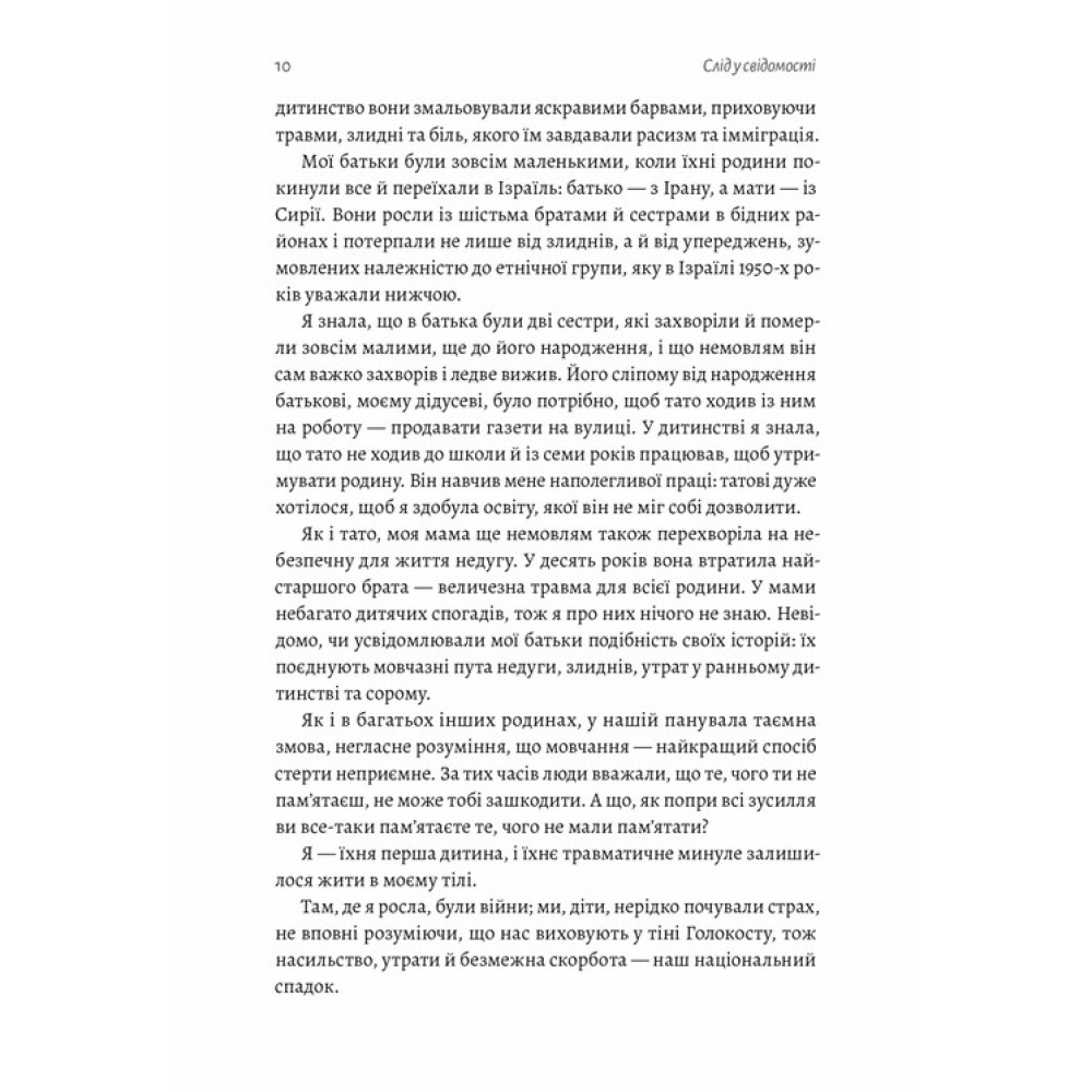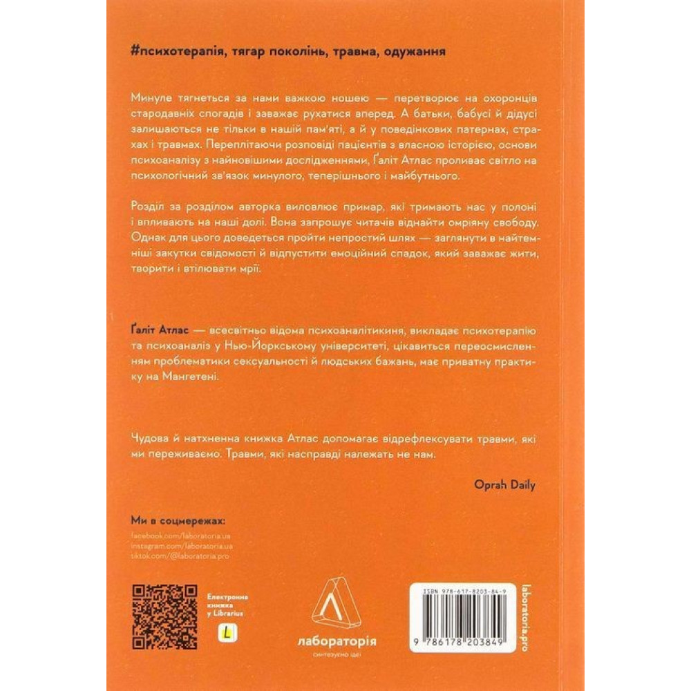 «Емоційний спадок. Як подолати травматичний досвід» за авторством Ґаліт Атлас має на меті допомогти відпустити травматичне минуле, щоб розпочати власний шлях. Воно починається від того, що ми здобуваємо у спадок від своїх батьків не тільки біологічні гени, а й травми поколінь, які разом із сімейними таємницями й дитячими спогадами міцно вплітаються у наше життя і непомітно формують характери, вчинки й поведінку.
