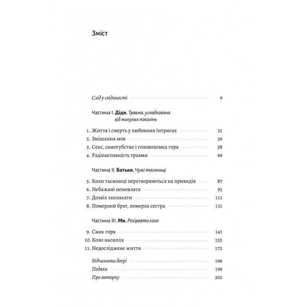 Авторка поєднала власний досвід, історії своїх пацієнтів і основи психоаналізу, щоб продемонструвати, як наші сьогоднішні страхи й проблеми пов'язані з емоційним спадком батьків, бабусь і дідусів. Книга проникає у найпотаємніші закутки людської психології і допомагає віднайти шлях до зцілення, тим самим надихаючи на відкидання усіх упереджень разом з хвилюваннями, аби зануритися у власну сімейну історію. Тільки наново проживши минуле й залишивши старі травми позаду, можна буде впевнено й легко рухатися до майбутнього.