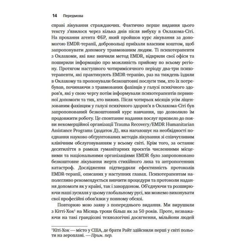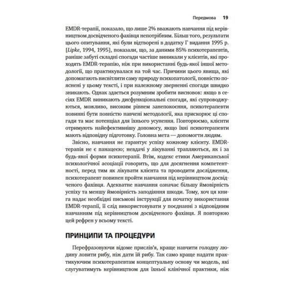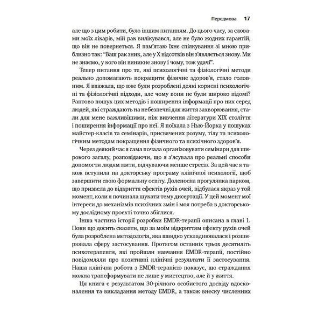 Книга «Психотерапія емоційних травм за допомогою рухів очей (EMDR), том 1. Основні принципи» від Френсін Шапіро була видана тиражем понад 100 тис. примірників та перекладена 10 мовами. У ній подається науково обгрунтований метод, спочатку розроблений для лікування посттравматичного стресового розладу. Нині ця терапія також використовується для лікування дорослих та дітей зі складними психологічними травмами, тривожними розладами, депресією, різними видами залежностей та іншими клінічними проблемами.