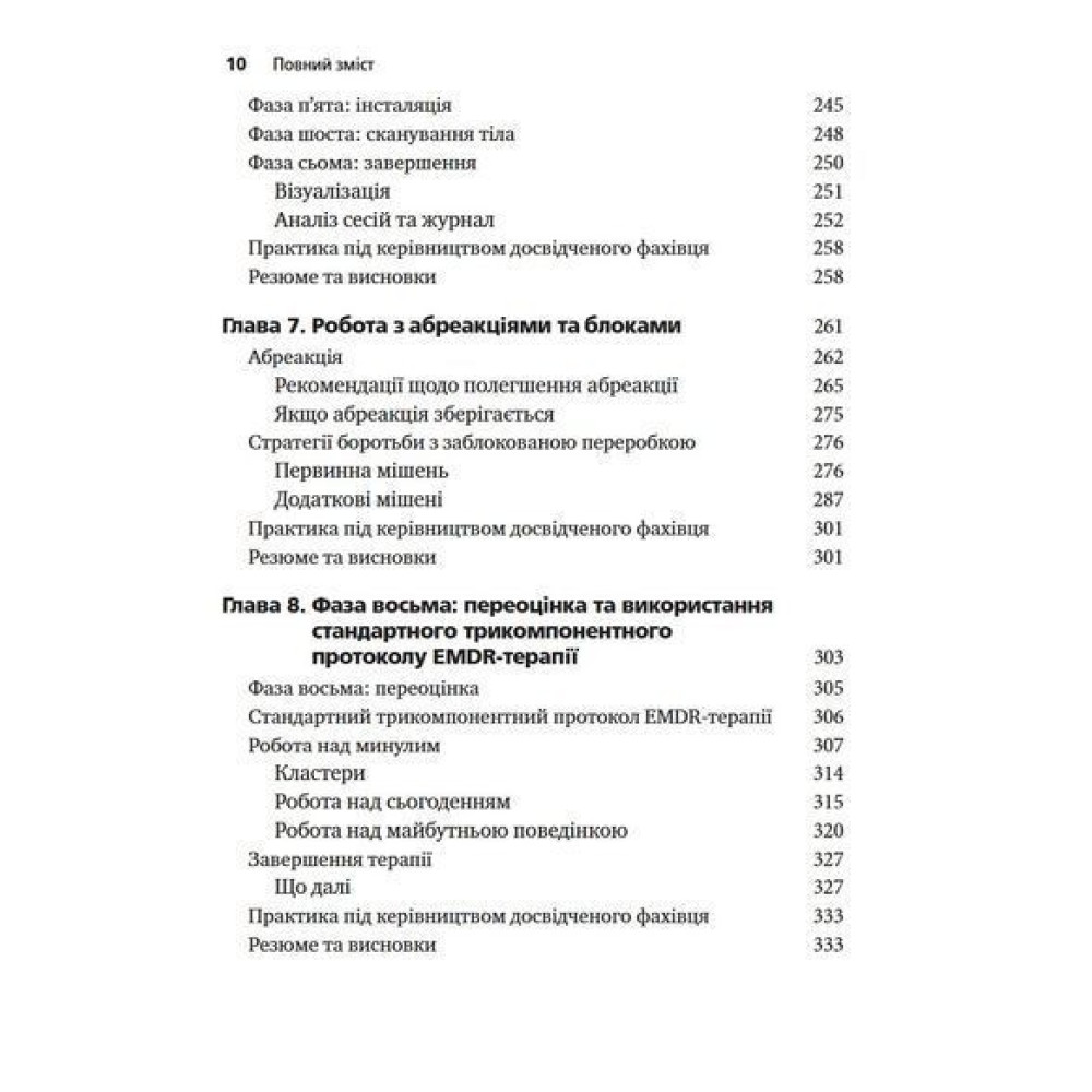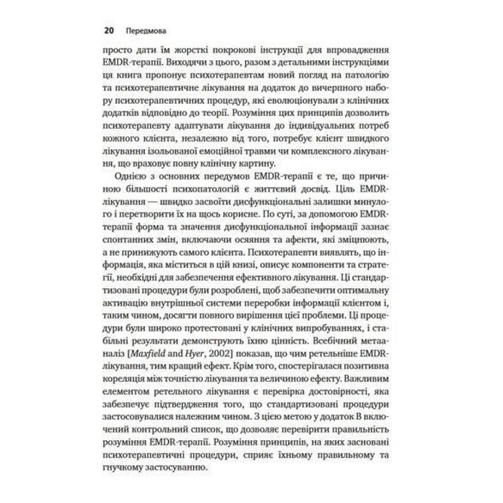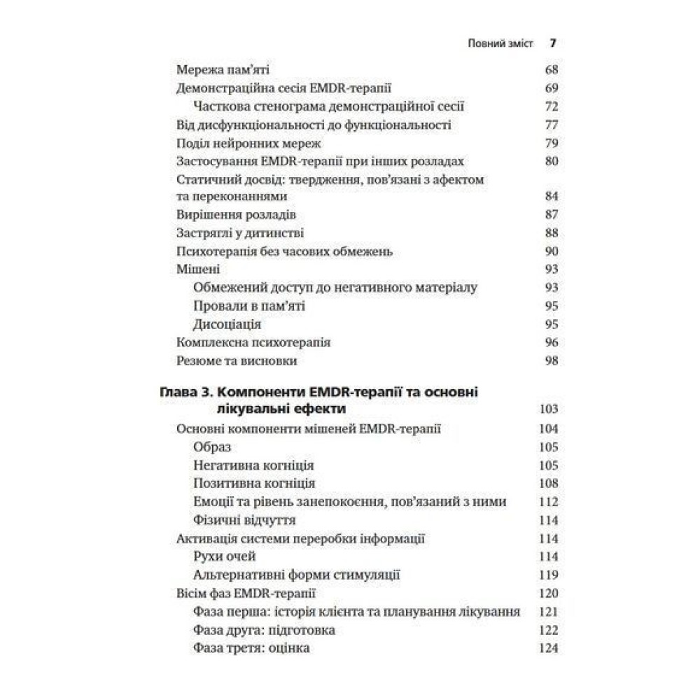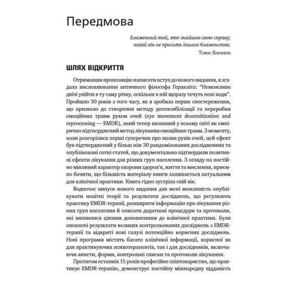 Розробниця EMDR-терапії Френсін Шапіро розглядає теоретичні та емпіричні основи терапії, детально описує етапи лікування та надає навчальні матеріали. У додатках до книги наведено протоколи сеансів, клінічні настанови та опис засобів для оцінки достовірності та результатів лікування.