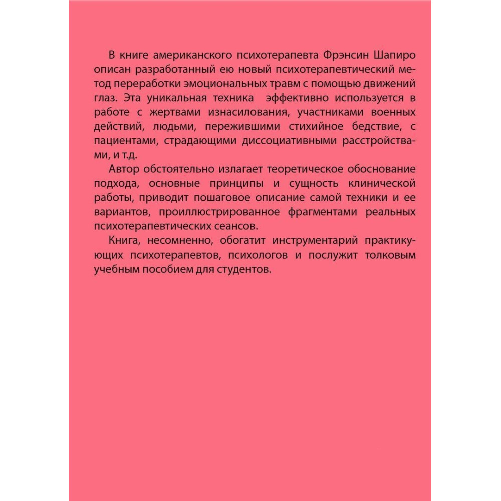Френсін Шапіро у своїй праці «Психотерапия эмоциональных травм с помощью движений глаз» описує власний інноваційний психотерапевтичний метод переробки емоційних травм за допомогою рухів очей. Цю унікальну техніку ефективно використовують у роботі з жертвами зґвалтування, учасниками воєнних дій, людьми, які пережили стихійне лихо, з пацієнтами, що страждають на дисоціативні розлади тощо.