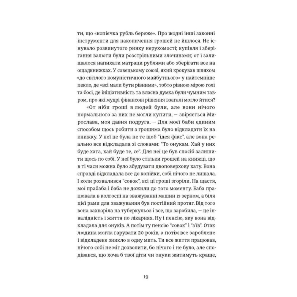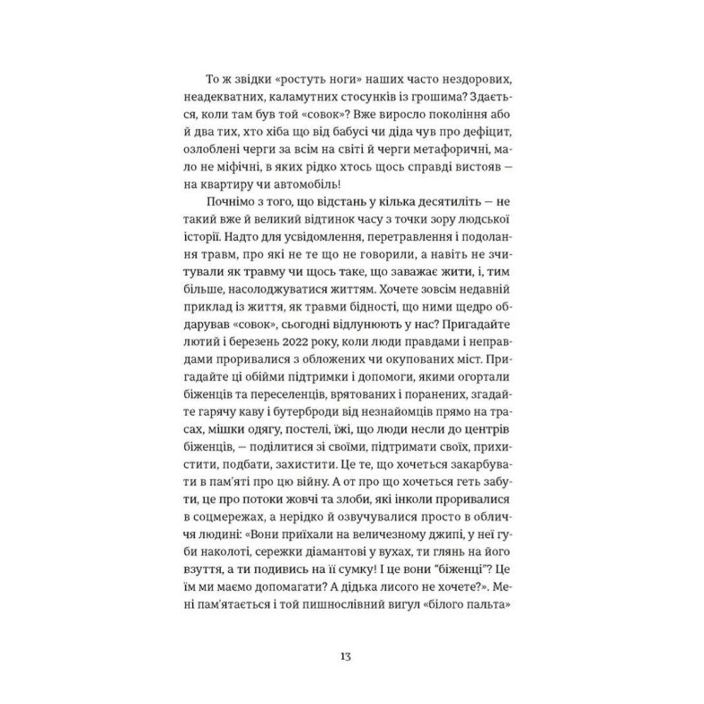 Книжка «Твоє, моє, нічиє та інше» — це коротка історія наших «совкових» травм крізь призму жіночого погляду від Ольги Карі. Тут ідеться про подолання колективного «совєцького октябрьонка», який навіть через три десятиліття після розпаду срср досі передається у спадок новим генераціям українців. І передається не лише народженим за часів існування совєцього диктату, не лише тим, хто дорослішав і набував життєвого досвіду в часи з викривленою мораллю та етикою, а й тим, хто народився вже у незалежній Україні, проте виховувався в лекалах і наративах совєцьких візій, традицій та взаємин.