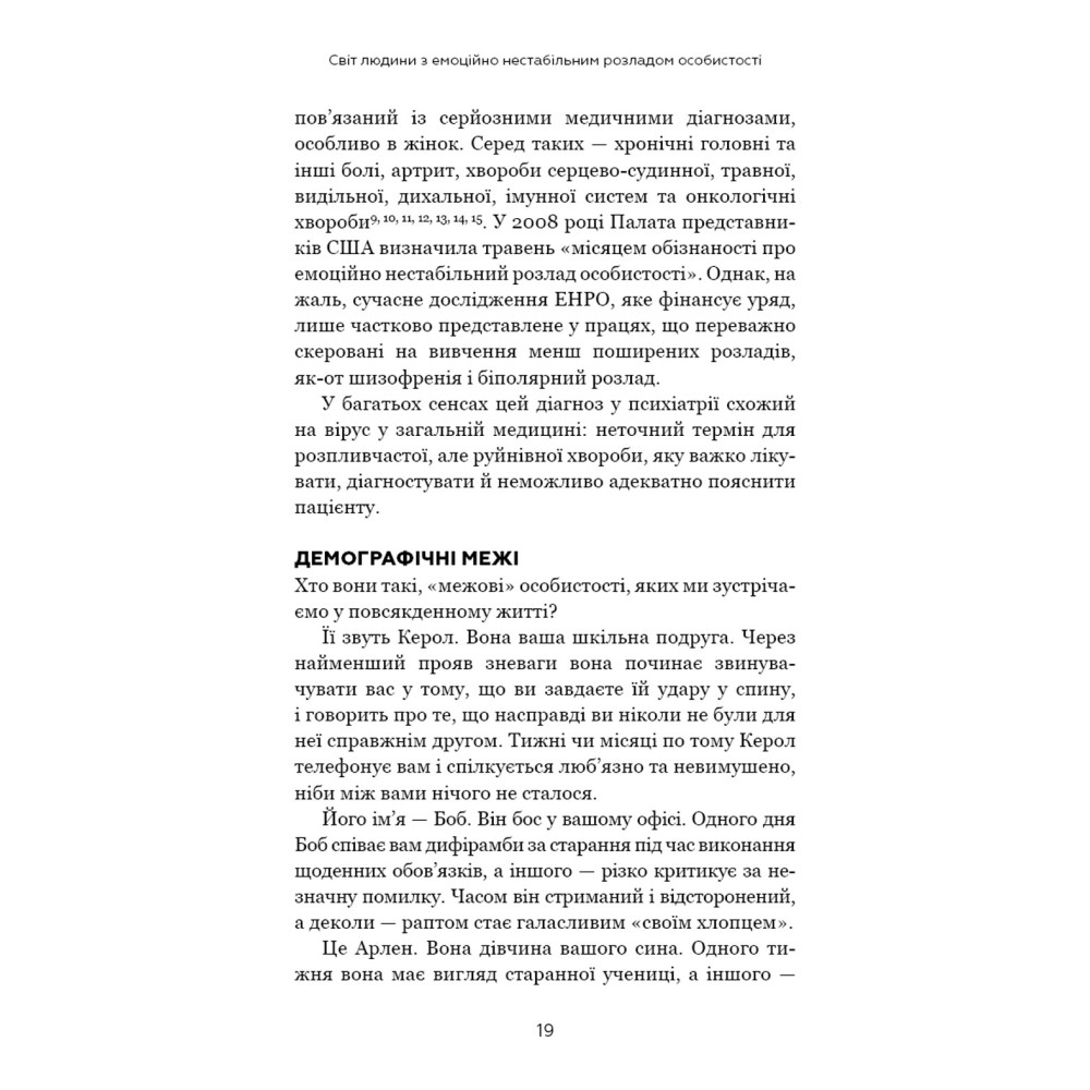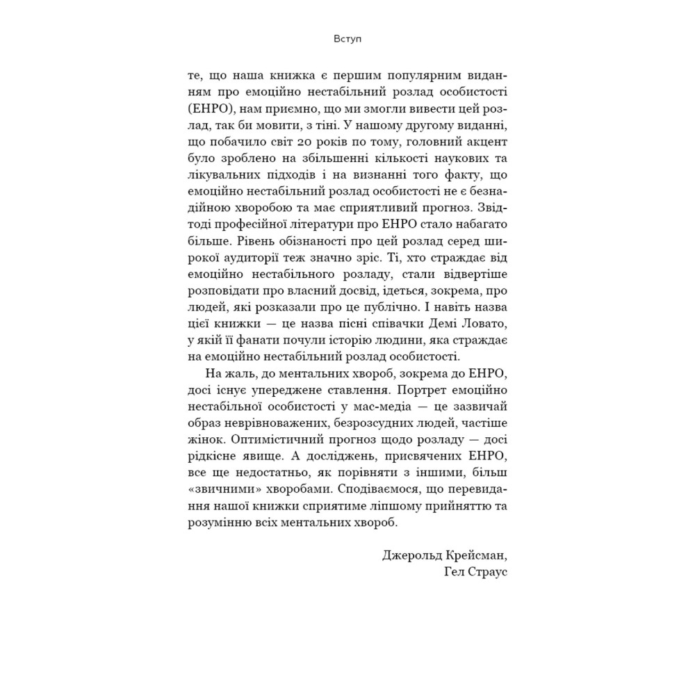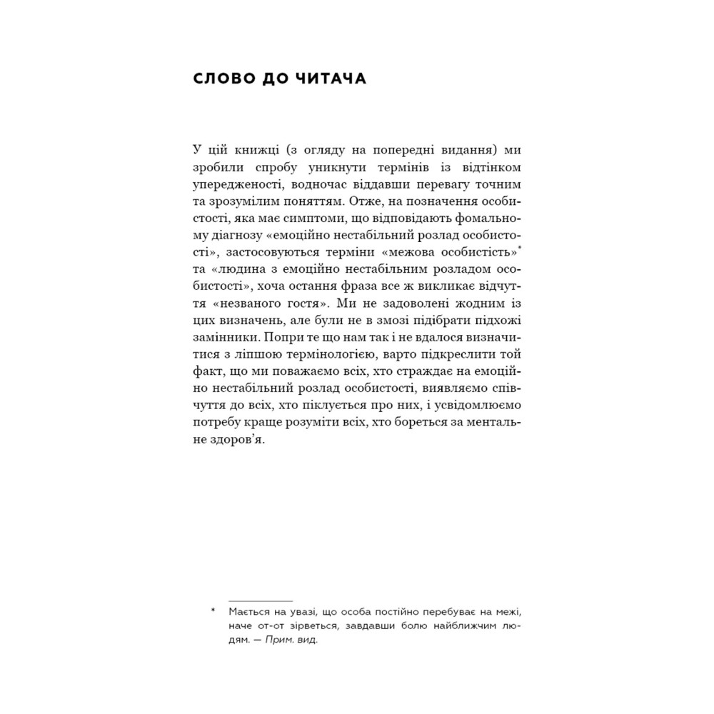Автори наводять численні приклади із життя з «важкими» людьми та показують шляхи врегулювання стосунків із ними — як психотерапевтичні, так і фармакологічні. Розширене й доповнене видання залишилося таким же доступним і корисним для всіх — від професіоналів до пересічних читачів — і стане цінним джерелом інформації як для людей, які живуть із емоційно нестабільним розладом особистості, так і для їхніх рідних, друзів та колег.