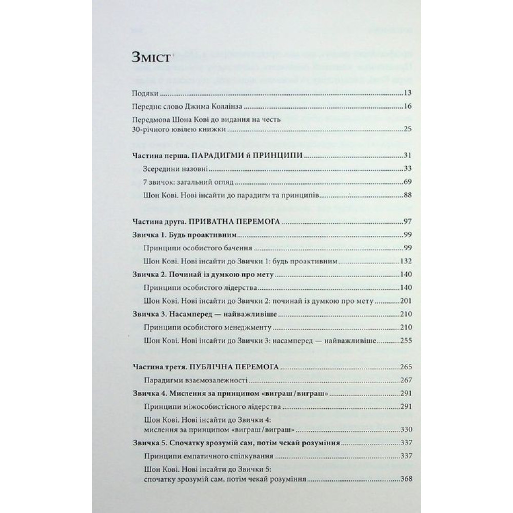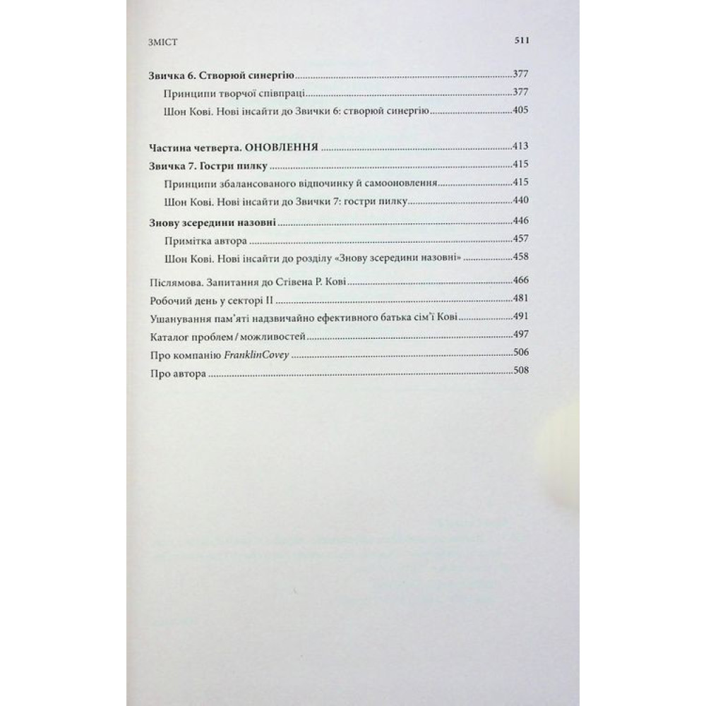 Книжка «7 звичок надзвичайно ефективних людей. Потужні інструменти розвитку особистості» за авторством Стівена Р. Кові — світовий супербестселер, праця № 1 у темі росту особистості, яка позитивно вплинула на життя мільйонів людей в усьому світі, серед яких були навіть Білл Клінтон та Стівен Форбс. Керівництво навчить вас краще розуміти себе, визначати пріоритети, формулювати життєві цілі й досягати їх.