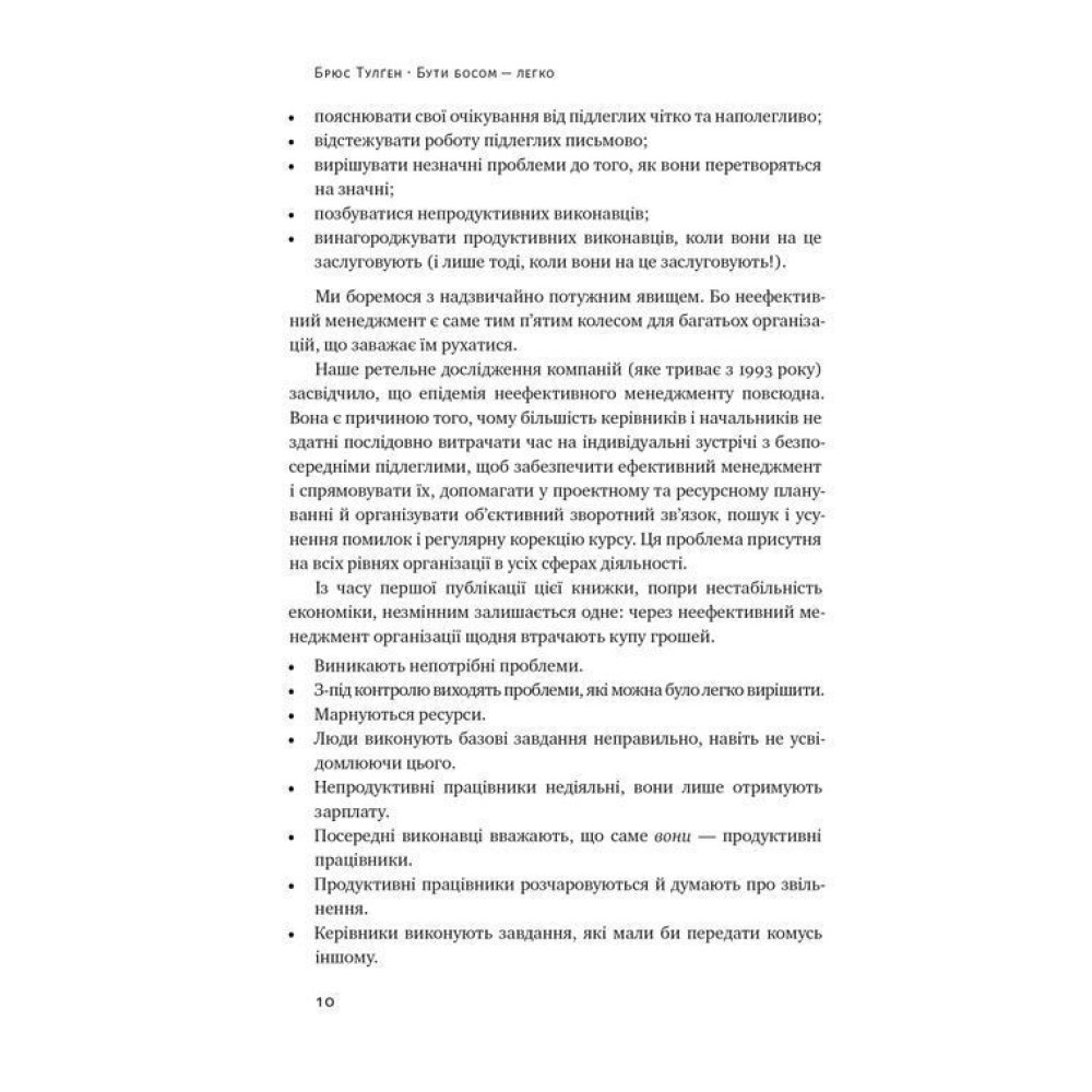 Ви відчуваєте, що не маєте достатньо часу, щоб керувати своїми людьми? Чи уникаєте ви спілкування зі співробітниками, тому що не любите конфронтації? У книзі «Бути босом — легко. Покрокова інструкція, як керувати ефективно» Брюс Тулґен порушує ключову проблему сучасних керівників — епідемію неефективного менеджменту.