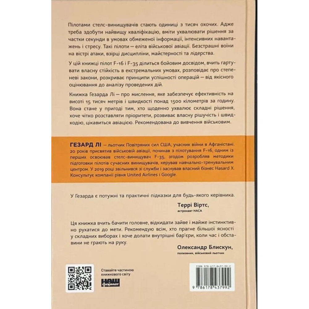 У своїй книжці «Чітке мислення. Мистецтво ухвалювати складні рішення від пілота стелс-винищувача» пілот F-16 і F-35 Гезард Лі ділиться бойовим досвідом, вчить гартувати власну стійкість в екстремальних умовах, розповідає про три степеневі закони, розкриває принципи успішності операцій — від якісного оцінювання до аналізу проведених дій.