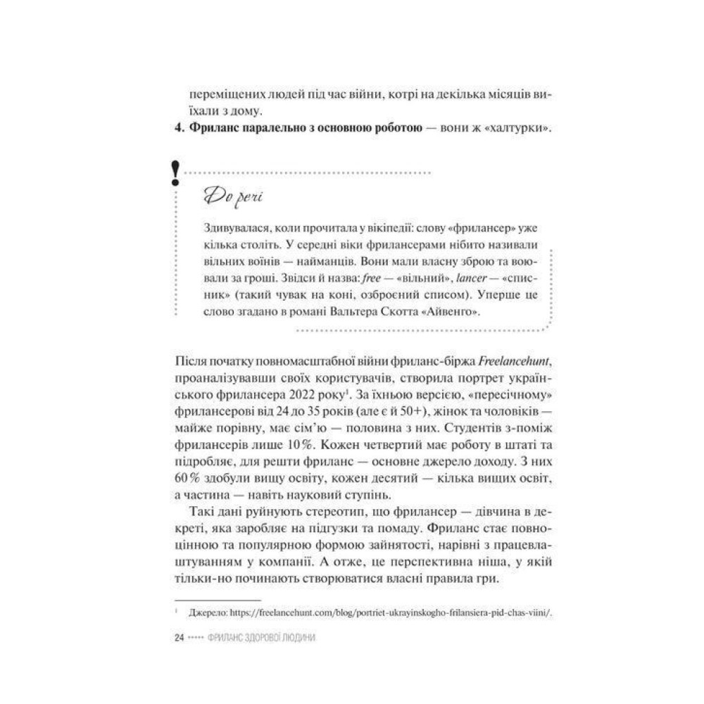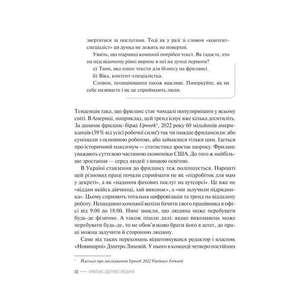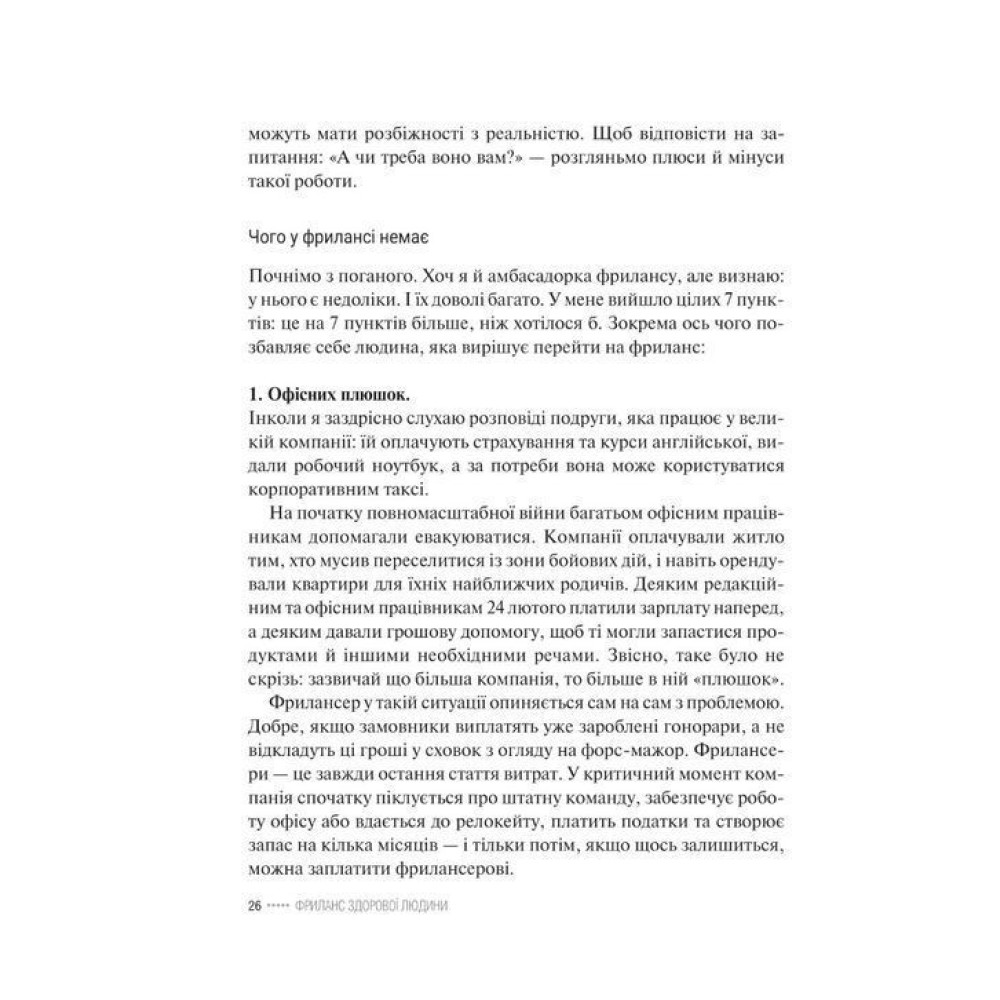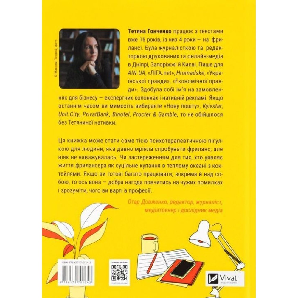 Десять років тому фрилансери вважалися ледь не якимись «безробітними-халтурниками» та диваками в деякому сенсі. Тоді як зараз фриланс знаходиться на своєму піку, особливо з появою пандемії: якщо можна працювати віддалено, то навіщо прив’язуватися до одного роботодавця? Але є інша проблема: як порахувати прайс на свої тексти і як не потонути в прокрастинації, коли ти вдома і на щось відволікаєшся? Як, нарешті, вести ефективні переговори із замовниками й не провалювати палаючі дедлайни? Авторка цієї книжки провела два десятки інтерв’ю з досвідченими виконавцями та наймачами, аби вивести формулу комфортного фрилансу, який допоможе зберігати сталий баланс між життям і роботою, а також стабільно заробляти.