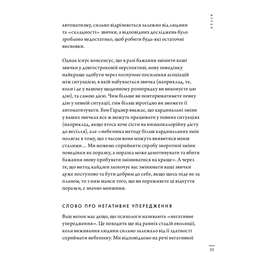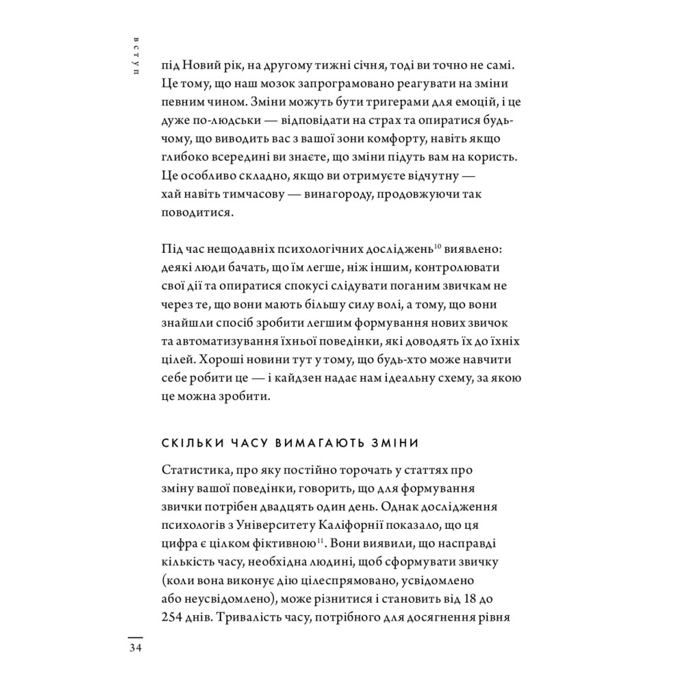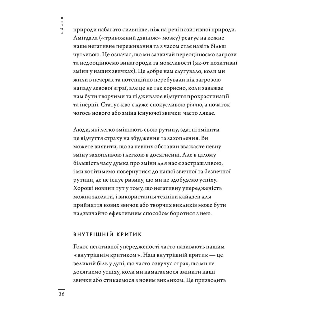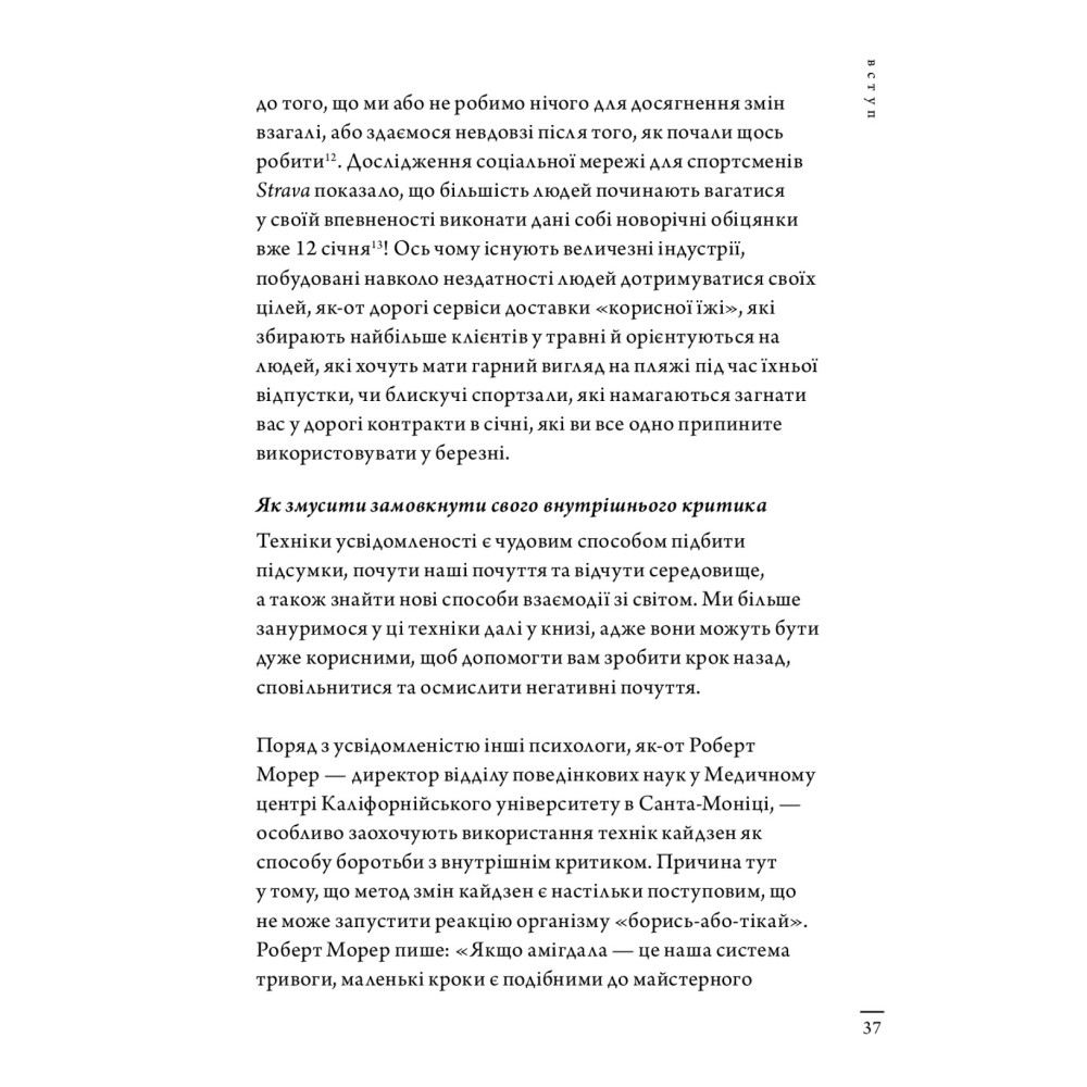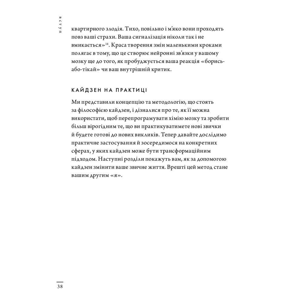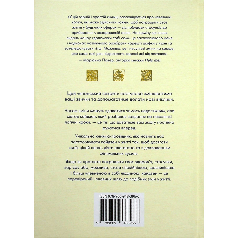 А чи чули ви щось про кайдзен — концепцію, що допомагає легко, без надмірного напруження, «не ламаючи» себе, змінити свої усталені звички і спосіб життя заради досягнення більшого? Інакше кажучи, кайдзен (у перекладі з японської — «хороші зміни», «покращення»), якому присвячена книга Сари Харві «Кайдзен. Японський підхід до поступової зміни звичок», дає розуміння того, як можна навіть найсміливіший намір перетворити на низку нескладних, цілком досяжних кроків.
