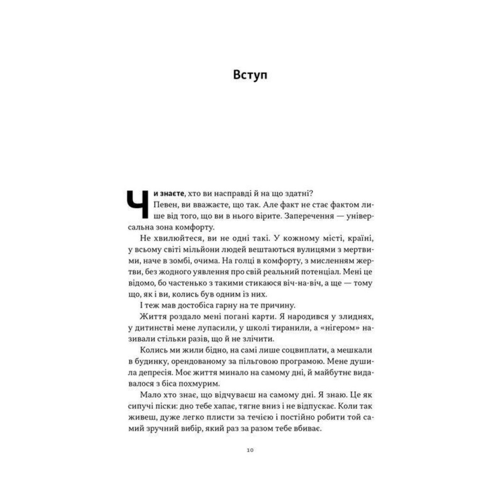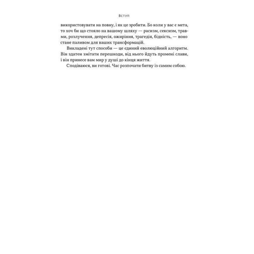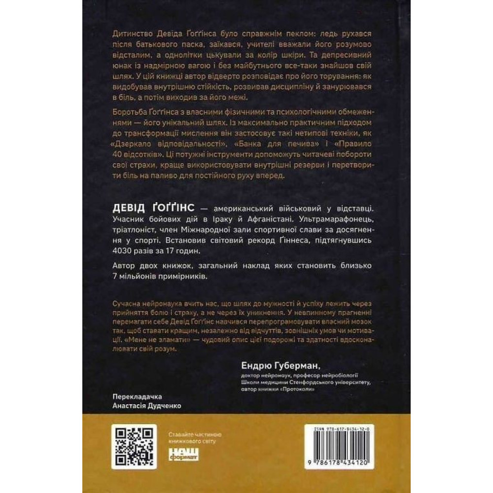 У книзі «Мене не зламати. Гартуй дух і кидай собі виклики» Девід Ґоґґінс ділиться дивовижною історією свого життя, стверджуючи, що більшість з нас використовує лише 40% своїх можливостей. Надихаючий шлях автора, його боротьба з фізичними та психологічними обмеженнями, максимально практичний підхід до трансформації мислення — всі це потужні інструменти допоможуть читачеві побороти страхи, розкрити свій потенціал та перетворити біль у паливо для постійного руху вперед.