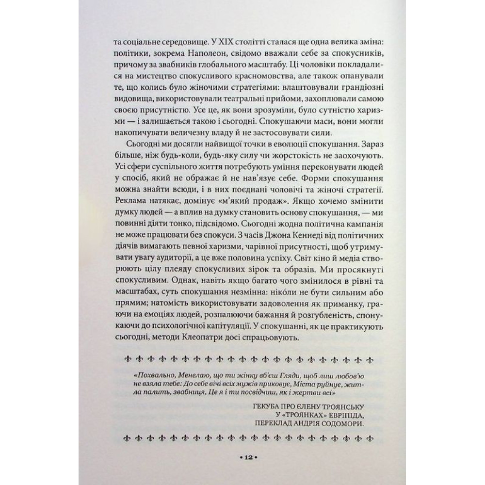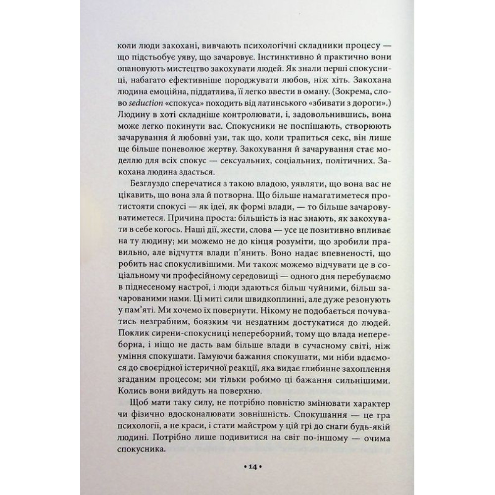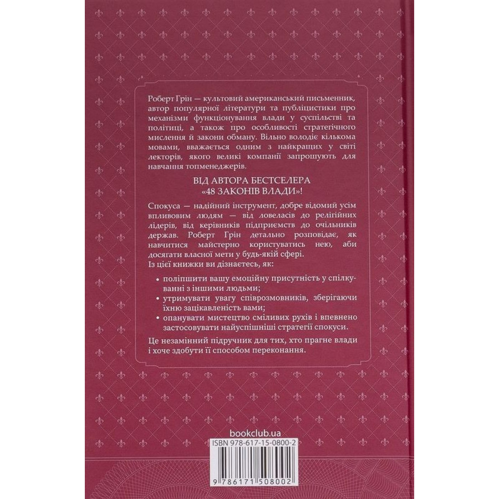 Спокуса — надійний інструмент, добре відомий усім впливовим людям — від ловеласів до релігійних лідерів, від керівників підприємств до очільників держав. Роберт Грін детально розповідає, як навчитися майстерно користуватись нею, аби досягати власної мети у будь-якій сфері.