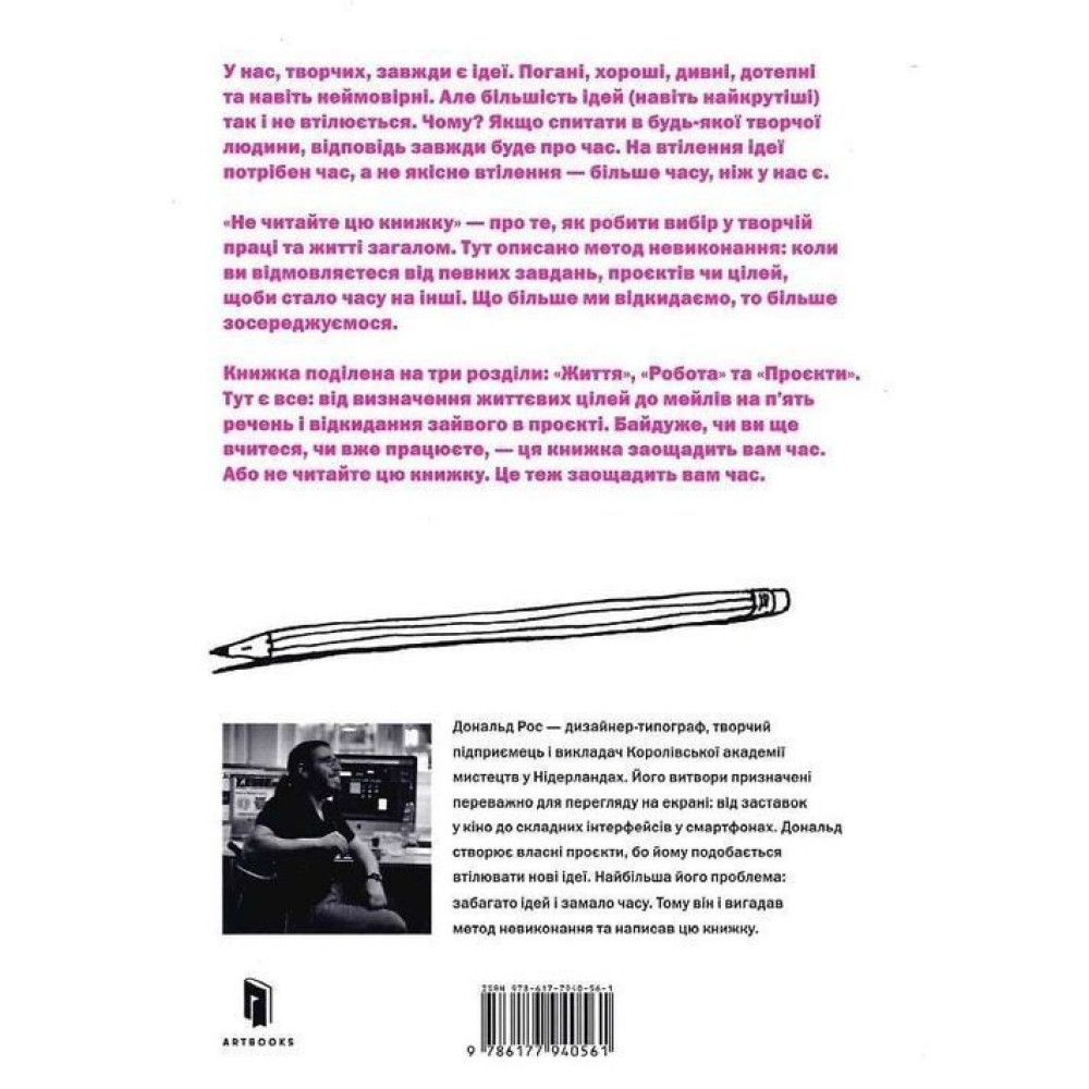 Дональд Рос із власного досвіду розповідає у книзі «Не читайте цю книжку. Тайм-менеджмент для творчих людей» про все, що давно хотілося довідатись: звички, стиль і спосіб життя, мозкові процеси, побут, час творчих людей. Тож ця книжка буде актуальною для будь-кого — досвідченого митця чи аматора, студента чи професійного дизайнера, власника бізнесу або домогосподарки. Абсолютно КОЖНА людина знайде для себе потрібні ключики до управління своїм часом — чиста магія.