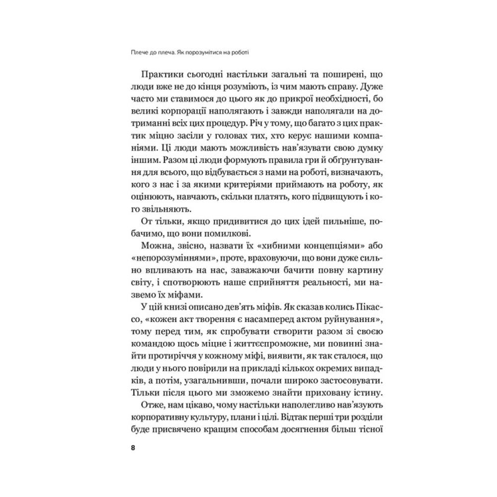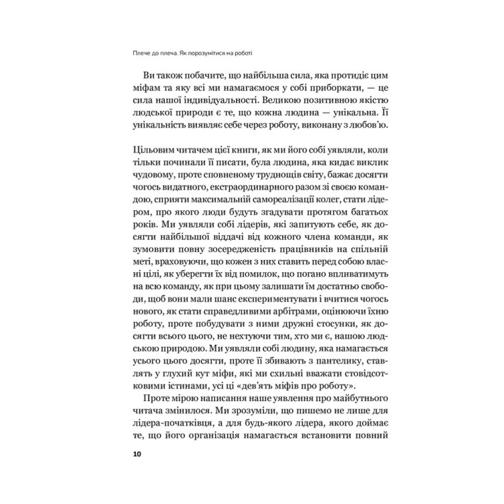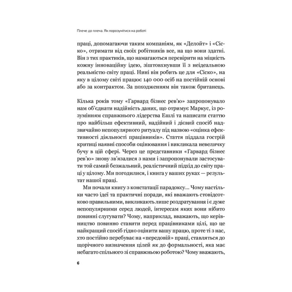 «Плече до плеча. Як порозумітися на роботі» Маркуса Бакінгема і Ешлі Ґудолл перевертає уявлення про управління та комунікацію в світі сучасного бізнесу. Що, як каскадування цілей вже не є запорукою ефективного робочого процесу, а зворотний зв’язок — не основою успішної комунікації? Книга висвітлює, як сучасні пандемічні реалії викликали необхідність переосмислення офісних моделей та впровадження нових підходів до комунікації й управління персоналом. Автори пропонують читачеві не лише новий погляд, але й конкретні інструменти для ефективної оптимізації робочих процесів і підтримки позитивної атмосфери в колективі. Книга стане своєрідним компасом для сучасних керівників і співробітників, які прагнуть змінити власний підхід до управління та спілкування в умовах нової реальності бізнесу.