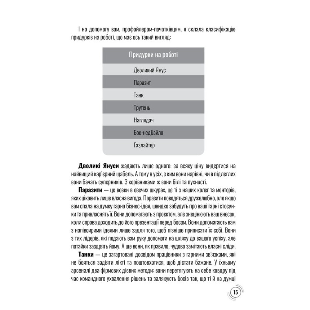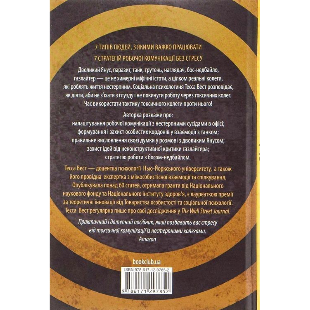 Дволикий Янус, паразит, танк, трутень, наглядач, бос-недбайло, газлайтер — це не химерні міфічні істоти, а цілком реальні колеги, які роблять життя нестерпним. Соціальна психологиня Тесса Вест розповідає у посібнику «Придурки на роботі. Токсичні колеги і що з ними робити», як діяти, аби не з’їхати з глузду і не покинути роботу через токсичних колег. Час використати тактику токсичного колеги проти нього!