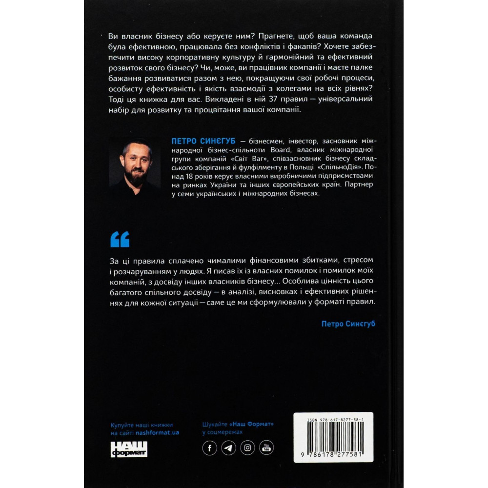 Книга за авторством Петра Синєгуба «PRO 37 правил і принципів бізнесу» ідеально підійде, якщо ви є власником бізнесу або його управлінцем і прагнете, щоб ваша команда була ефективною, працювала без конфліктів і факапів. Крім того, хочете забезпечити високу корпоративну культуру й гармонійний та ефективний розвиток свого бізнесу.