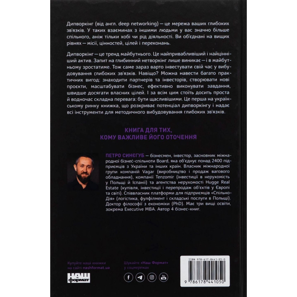 Книжка «PRO глибинний нетворкінг» від Петра Синєгуба присвячена дипворкінгу (похідне від нетворкінг) — мережі ваших глибоких зв’язків. Такі люди мають з вами набагато більше спільного, аніж тільки хобі чи рід діяльності. Ви об'єднані на вищих рівнях — місії, цінностей і переконань. Дипворкінг — це тренд майбутнього. Запит на побудову глибоких зв'язків лише виникає. У майбутньому він посилюватиметься. Тож саме зараз варто інвестувати свій час у вибудовування глибоких зв’язків.
