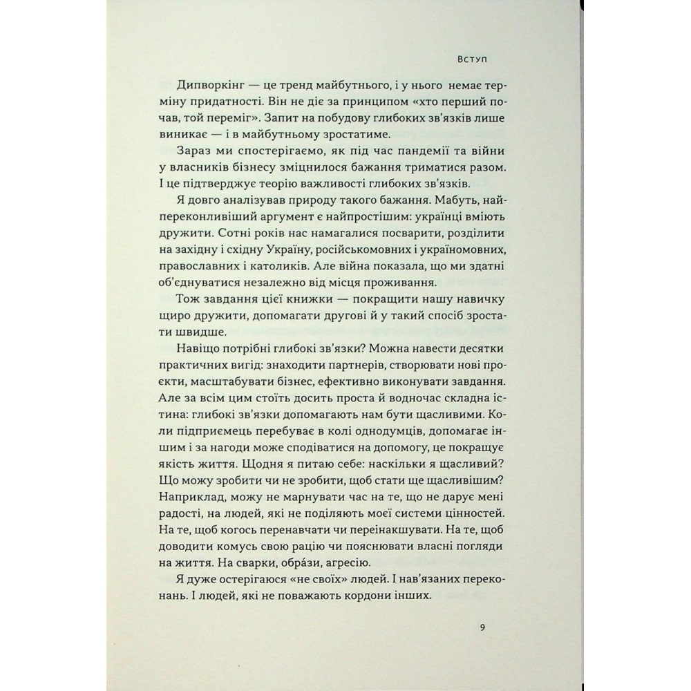 Навіщо? Можна навести багато практичних вигод: знаходити партнерів, створювати нові проєкти, масштабувати бізнес, ефективно виконувати завдання. Але за всім цим стоїть досить проста й водночас складна перевага: глибокі зв'язки допомагають нам бути щасливими. Тому пропоную вам поринути у світ дипворкінгу — вміння вибудовувати глибокі зв'язки.