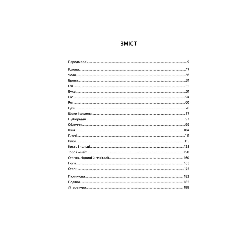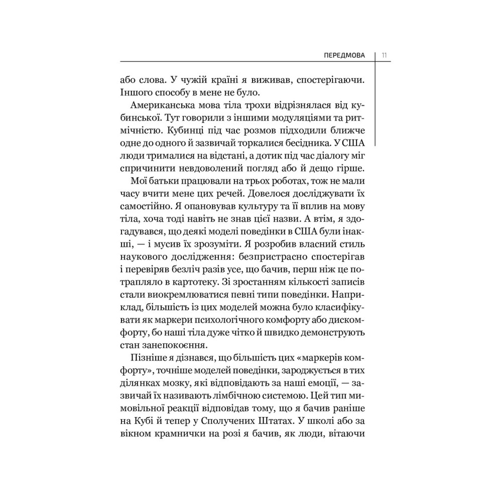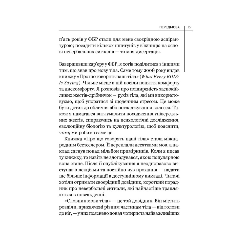 Вона складається з розділів, присвячених різним частинам тіла, і містить статті про понад чотириста найважливіших моделей поведінки, які автор зібрав за довгі роки спостережень. Ви навчитеся розпізнавати справжні почуття вашого візаві за ледь помітними змінами в зіницях; дізнаєтеся, як губи можуть виражати побоювання або небажання ділитися інформацією; ознайомитеся з безліччю варіантів жестикулювання і значенням кожного з них, а також знайдете багато цікавих порад, які допоможуть вам «читати» людей довкола.
