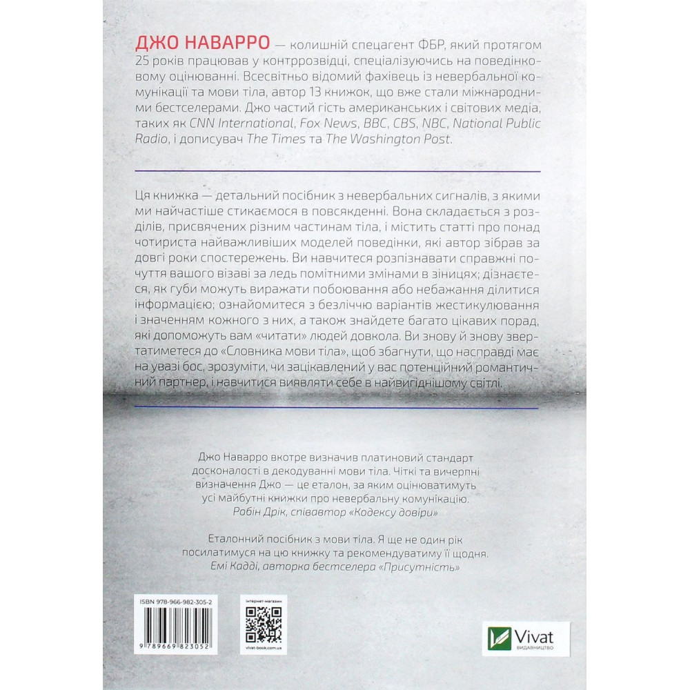 Джо Наварро — колишній спецагент ФБР, який протягом 25 років працював у контррозвідці, спеціалізуючись на поведінковому оцінюванні. Всесвітньо відомий фахівець із невербальної комунікації та мови тіла, автор 13 книжок, що вже стали міжнародними бестселерами. Джо частий гість американських і світових медіа, таких як CNN International, Fox News, BBC, CBS, NBC, National Public Radio, і дописувач The Times та The Washington Post.