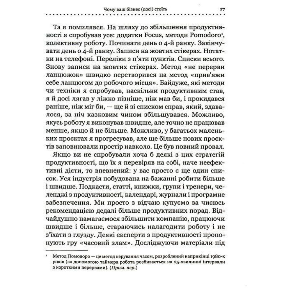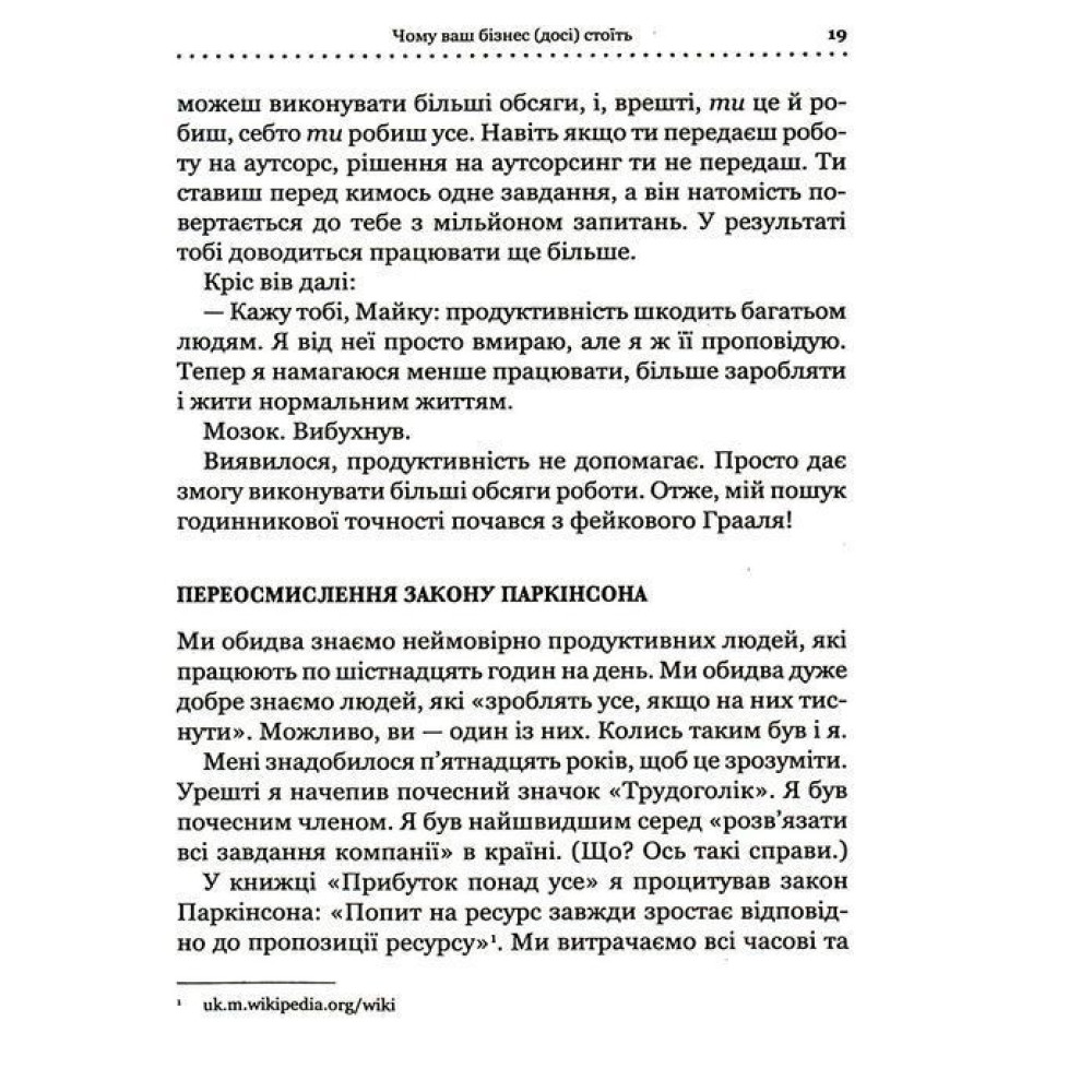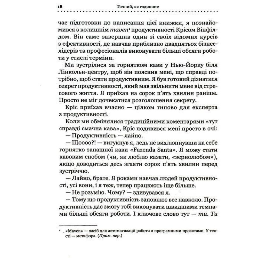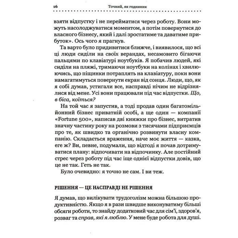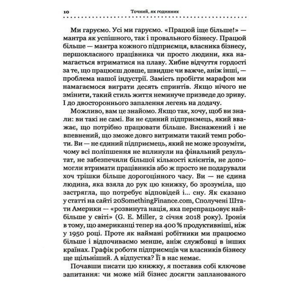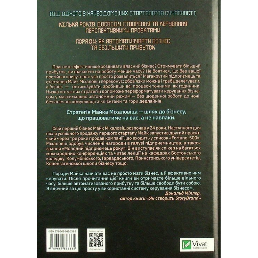 Книга Майка Міхаловіца — «Точний як годинник. Створи свій бізнес, щоб керувати собою» — особливо корисна, якщо ви прагнете більш ефективно розвивати власний бізнес, отримувати більший прибуток, при цьому витрачаючи на роботу менше часу. Та боїтесь, що без вашої постійної присутності усе просто розвалиться. Успішний й досвідчений підприємець, крім того, стартапер Майк Міхаловіц переконує в своєму творі, що обов’язки треба і навіть можна делегувати, а бізнес — оптимізувати, зробивши всі процеси точними, майже як годинник. Методики й підходи, що пропонує книга, можуть допомогти в усьому, що потрібно для успішного ведення своєї справи та балансу між життям і роботою, адже вони перевірені багаторічною практикою.