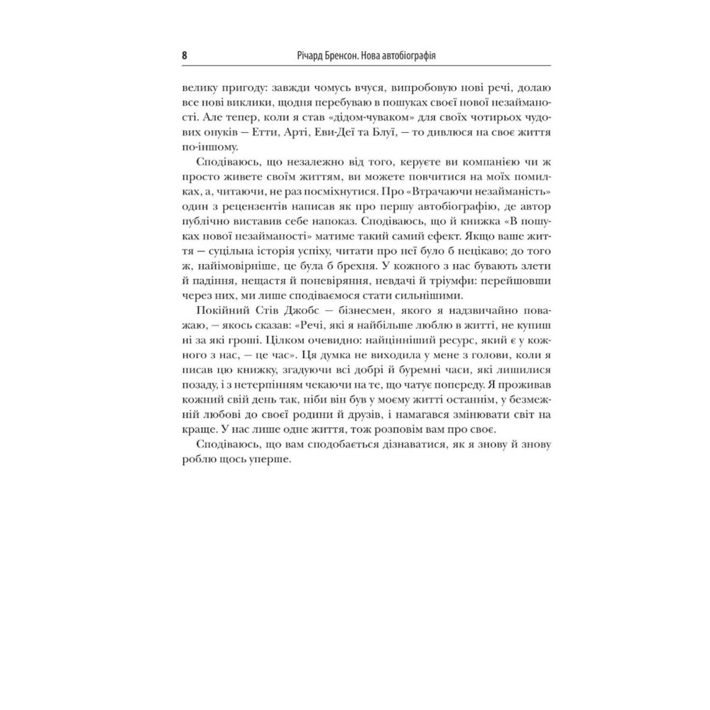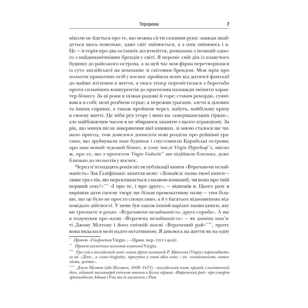Якщо ти здатен змінити світ довкола себе на краще, — змінюй; якщо тобі дано більше, ніж іншим, — неси максимум добра та позитиву. Таким є життєвий принцип успішного бізнесмена та щедрого мецената, шукача екстремальних пригод і чудового сім'янина, лицаря Її Величності і борця за права знедолених Річарда Бренсона — автора цієї автобіографічної книги — «У пошуках нової незайманості. Нова автобіографія», що є продовженням першої частини життєпису «Втрачаючи невинність».