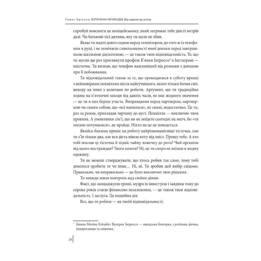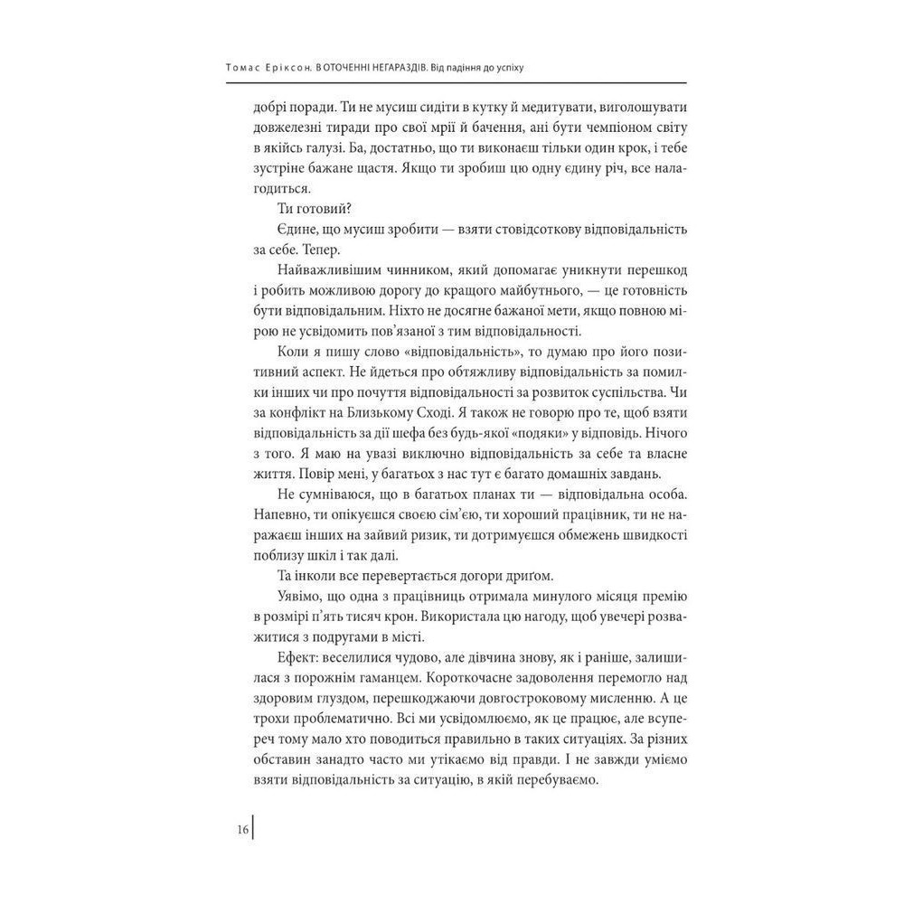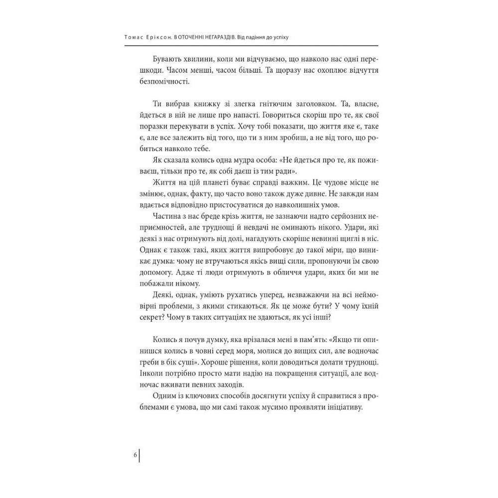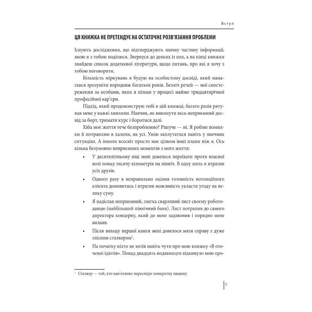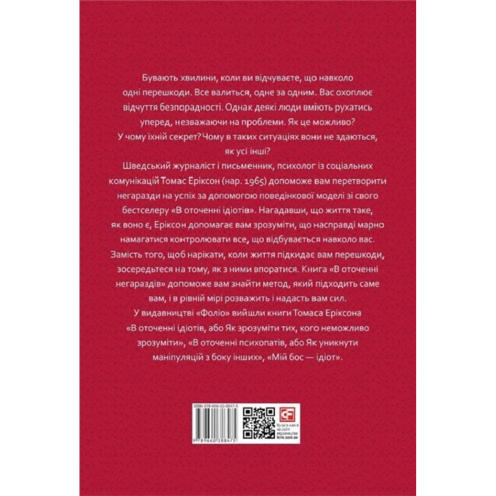 Бувають хвилини, коли ви відчуваєте, що навколо одні перешкоди. Все валиться, одне за одним. Вас охоплює відчуття безпорадності. Однак деякі люди вміють рухатись уперед, незважаючи на проблеми. Як це можливо? У чому їх секрет? Чому в таких ситуаціях вони не здаються, як усі інші? Шведський журналіст і письменник, психолог із соціальних комунікацій Томас Еріксон допоможе вам перетворити негаразди на успіх за допомогою поведінкової моделі зі свого бестселеру «В оточенні ідіотів».