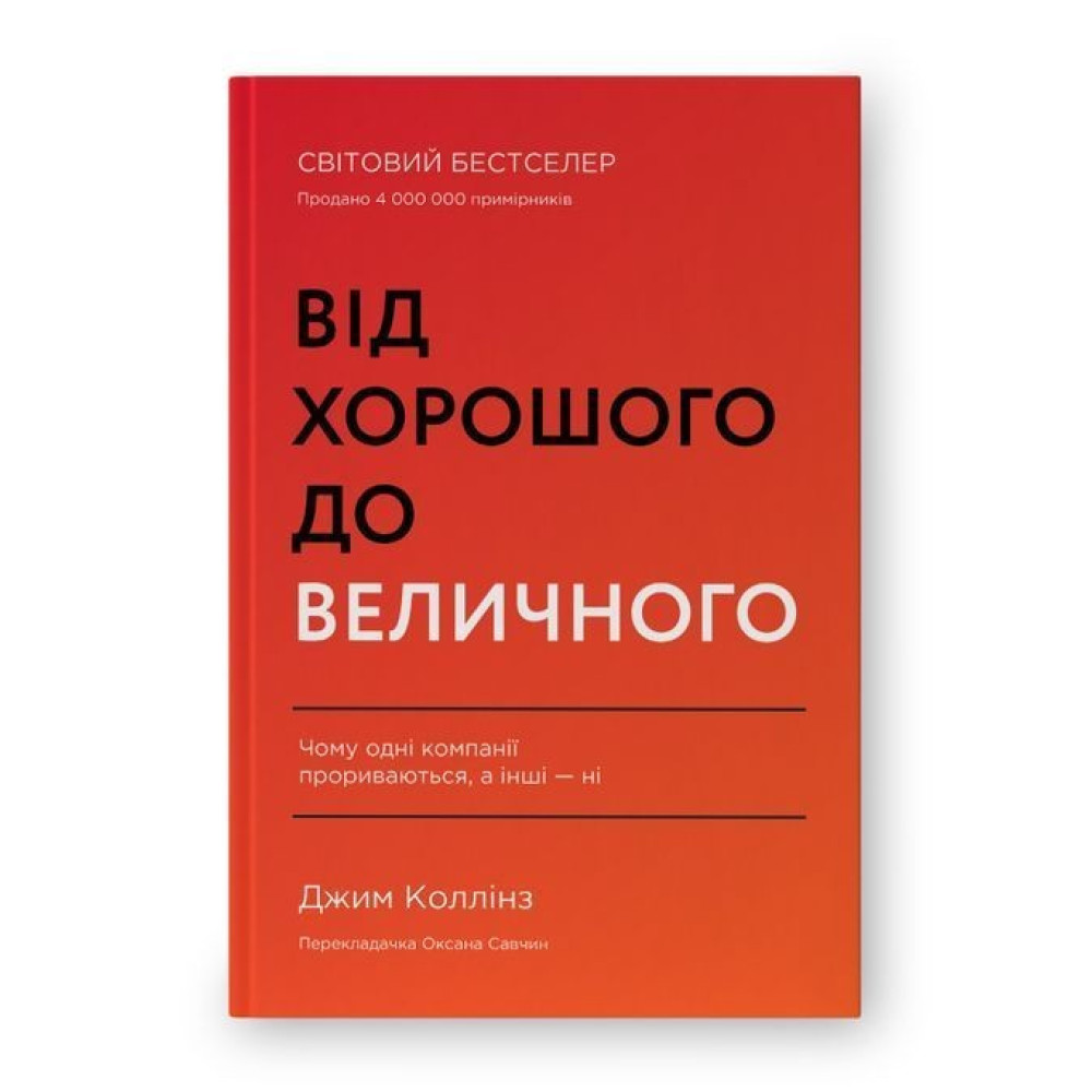 У книжці «Від хорошого до величного. Чому одні компанії прориваються, а інші — ні» Джим Коллінз аналізує діяльність і структуру компаній, яким вдалося здійснити прорив у вищу лігу бізнесу. Він відібрав фірми, які, попри всі кризи, п’ятнадцять років поспіль показували найкращі результати у своїй галузі. Як Gillette, Kimberly-Clark, Philip Morris та іншим вдалося взяти настільки високу планку? Джим Коллінз вивів формулу — дев’ять кроків, які дозволять розкрутити маховик успіху до швидкості, яка приносить шалені прибутки.