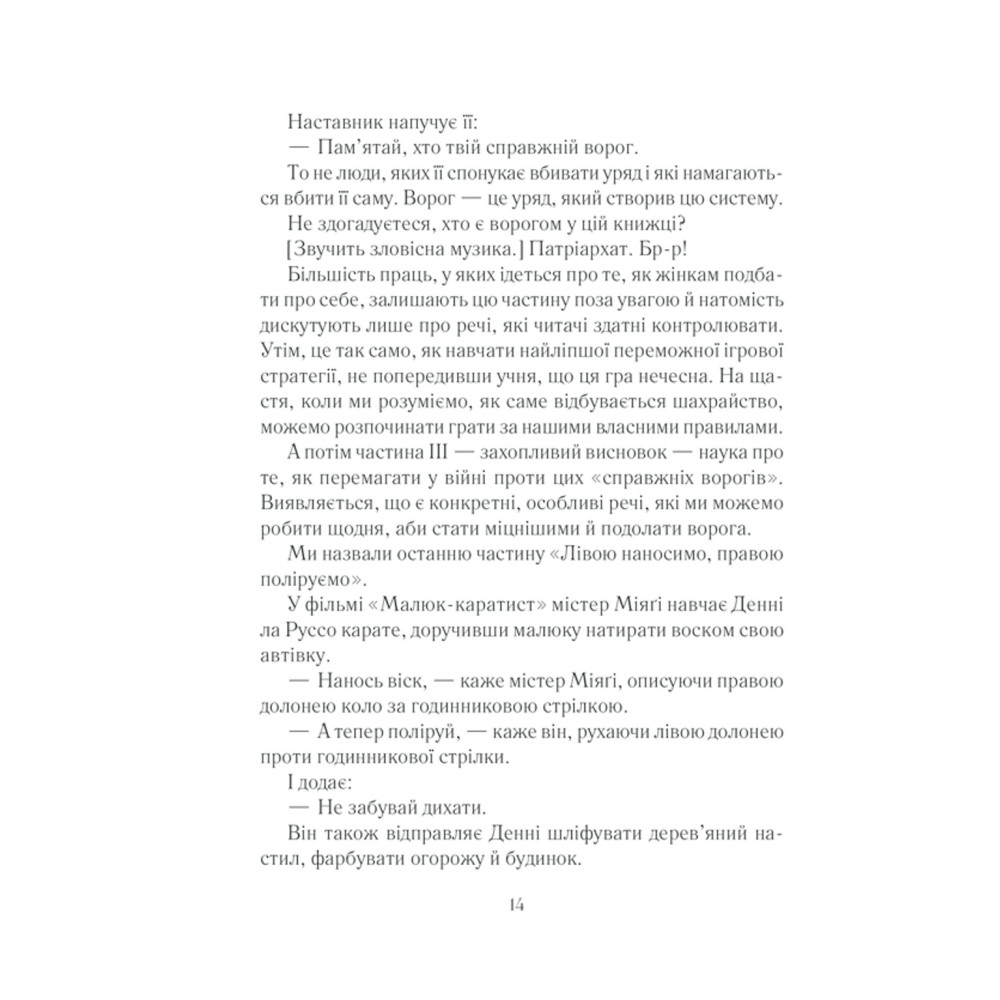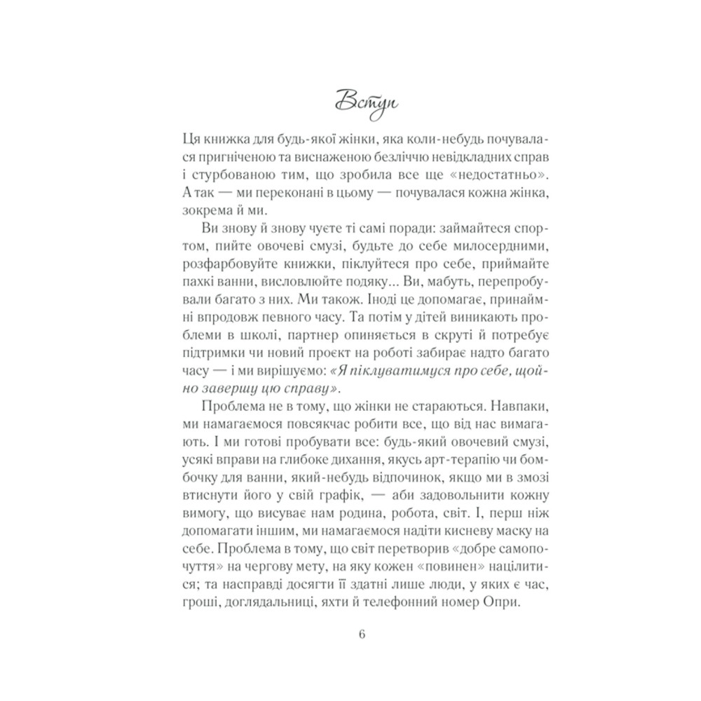 Як набридли одні й ті самі поради: займайтеся спортом, пийте овочеві смузі, будьте до себе милосердними, розфарбовуйте книжки, приймайте пахучі ванни, висловлюйте подяку... Тобі кажуть: «Ти маєш бути схожою на жінку з Instagram, із сяючою посмішкою, доглянутим волоссям, стаканчиком кави в руках та сповненої енергії». Досить цих патріархальних меж. Ми проти відірваних від реальності стереотипних порад для «щасливої жінки». І поки інші пані вперто прагнуть «мати все», ми навчимо тебе цінувати та любити те, що вже має кожна з нас, — себе: красиву, усміхнену та неповторну жінку.