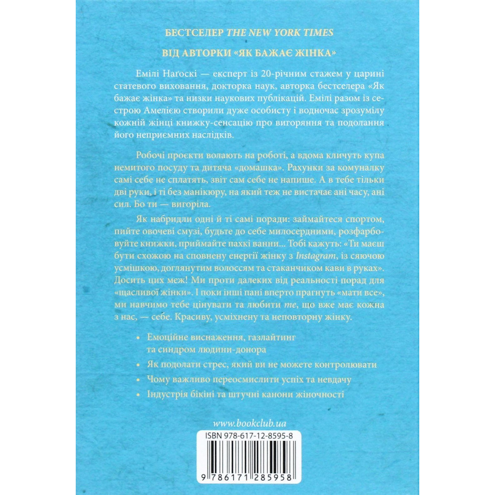 Книга Емілі та Амелії Наґоскі «Вигоряння. Стратегія боротьби з виснаженням удома та на роботі» навчить не вигоряти, швидко відновлюватися та щоразу знаходити нові сили і спокійно займатися справами за своїм пріоритетом, здебільшого призначена для жінок.