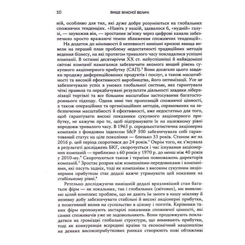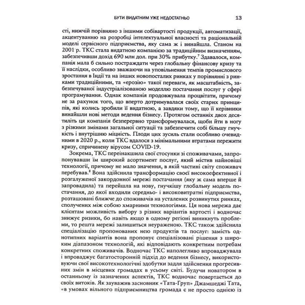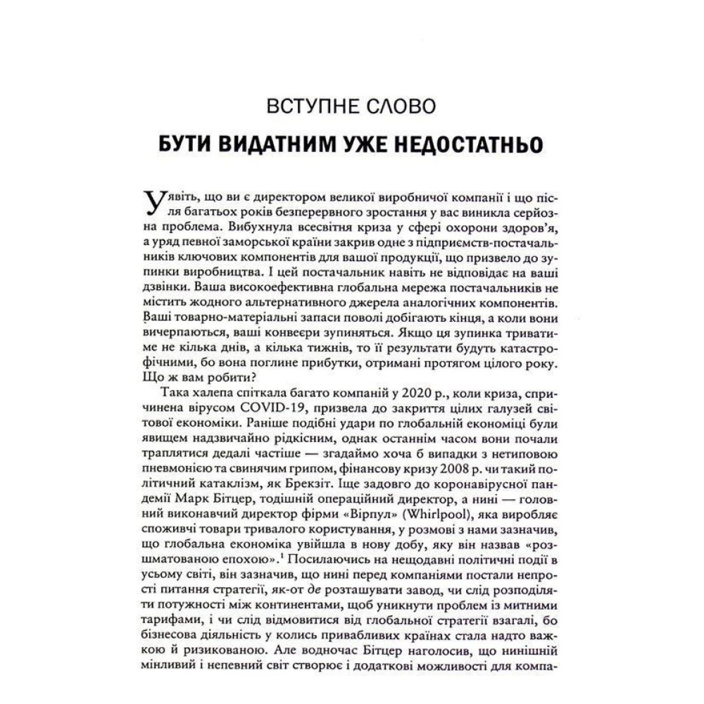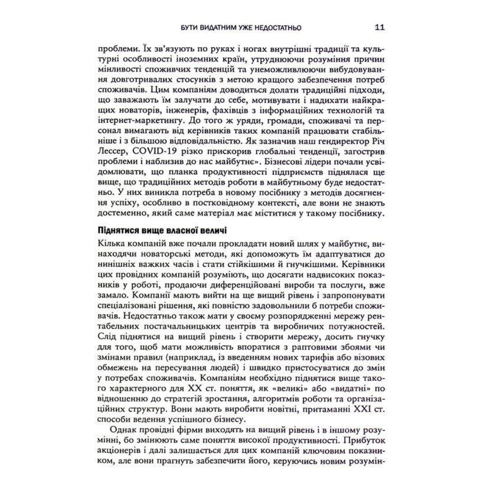 Задовольнятися старими робочими показниками, нехай навіть і видатними, вже не можна. Тож не варто розраховувати лише на методи здобуття конкурентної переваги, результатом якої є міцна операційна модель, високі прибутки акціонерів і вища загальна гнучкість компанії — нині цього вже недостатньо, настав час перевершувати самих себе. Бізнес-лідери мають взяти на озброєння радикально новий підхід до ведення бізнесу — він один здатен допомогти їхнім компаніям стати гнучкими й стабільними навіть у найважчих ситуаціях.