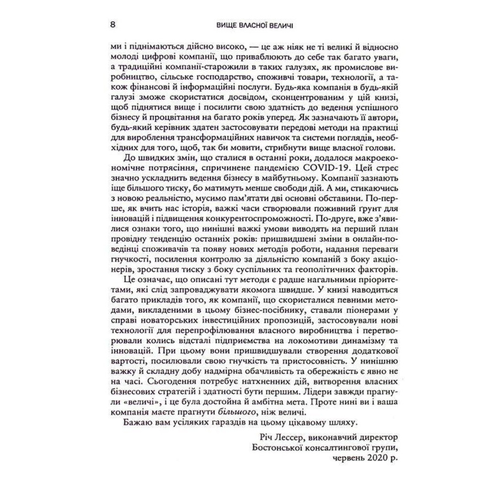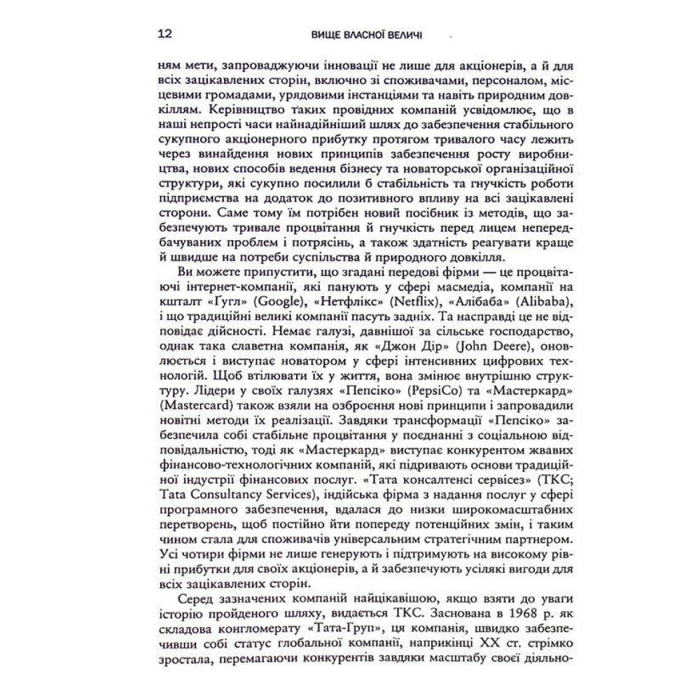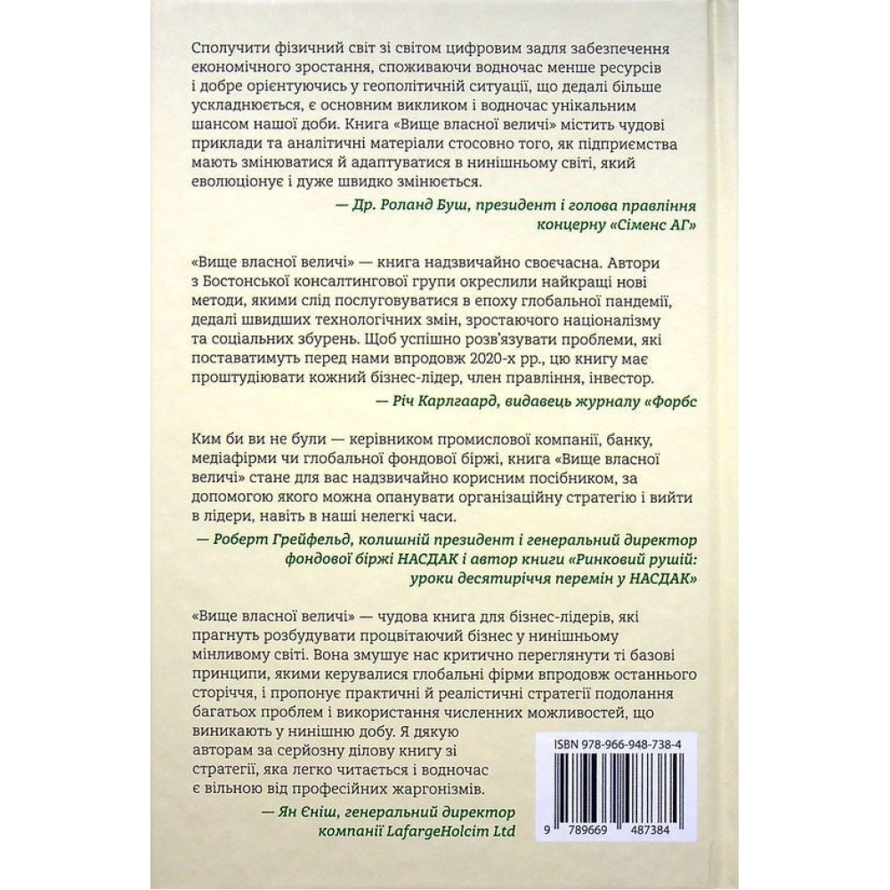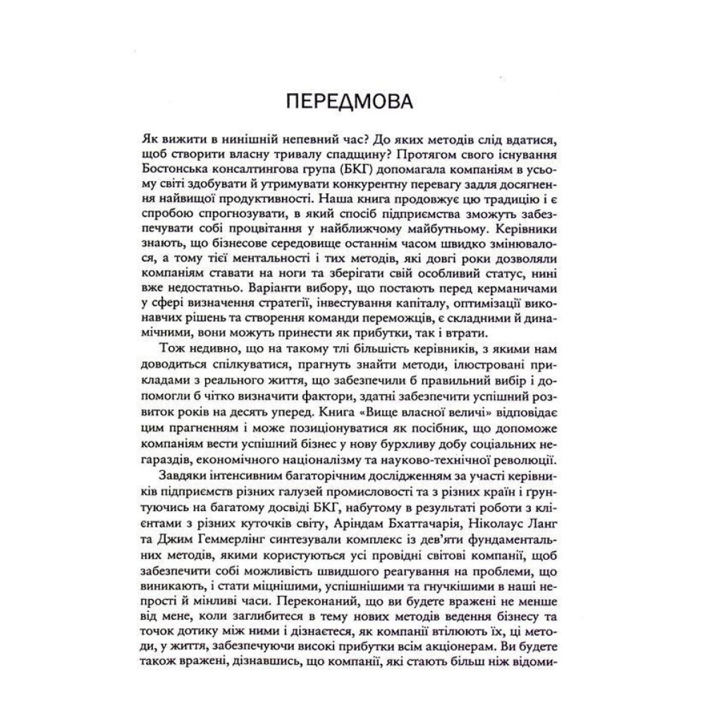 Книжка «Вище власної величі. Дев’ять способів забезпечити процвітання у добу соціальних негараздів, економічного націоналізму і науково-технічної революції» від Аріндама Бхаттачарьї, Ніколауса Ланга та Джима Геммерлінга присвячена правилам ведення успішного бізнесу в сучасних реаліях.
