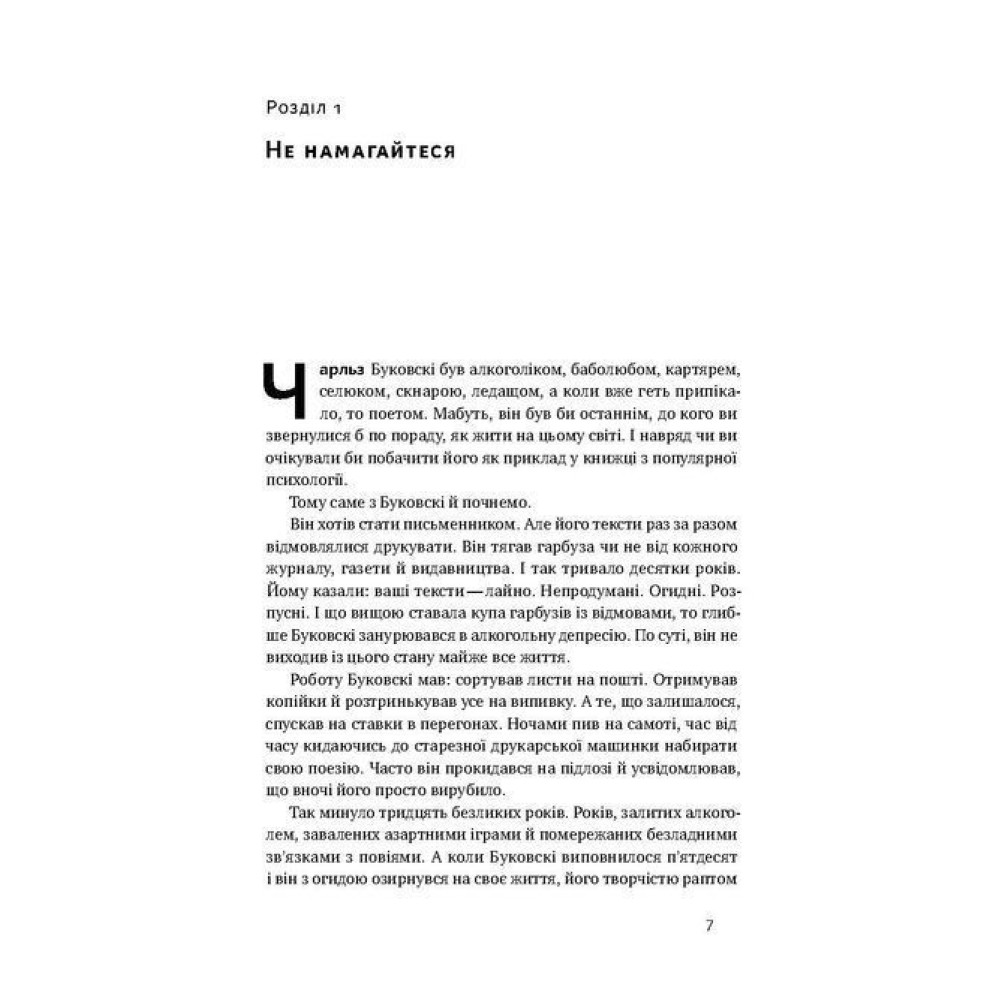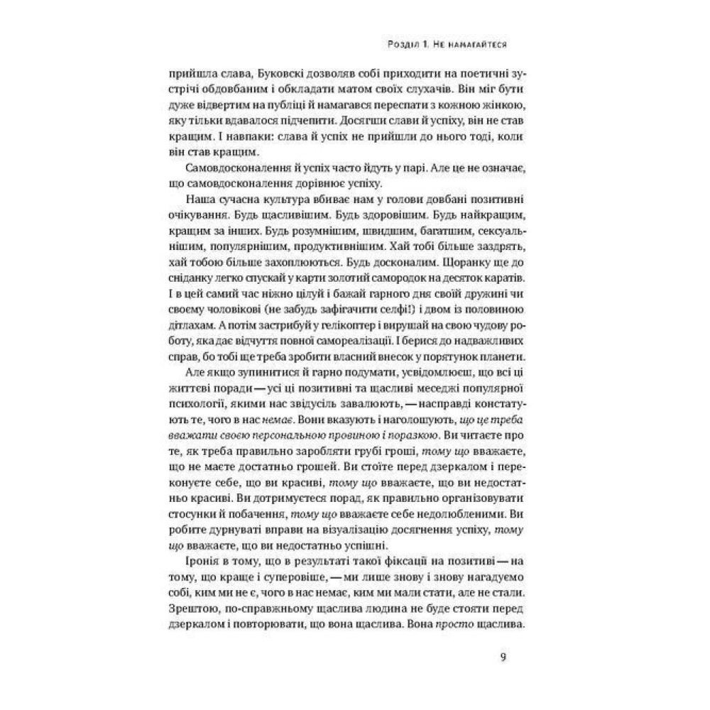 Ми живемо в культурі, зацикленій на занадто оптимістичних очікуваннях. Із самого дитинства нам нав'язують нереалістичні ідеали, яких ми прагнемо досягти попри все: лише найвищі оцінки, досконала зовнішність, надсучасні ґаджети, найкрутіша робота, тільки екзотичні подорожі й не менш яскраві світлини в соцмережах. Постійно женучись за успіхом і щастям, ми намагаємося уникати будь-якого негативу. Однак негативний досвід, як переконує Марк Менсон, надзвичайно цінний: він звільняє нас від міражу щастя.