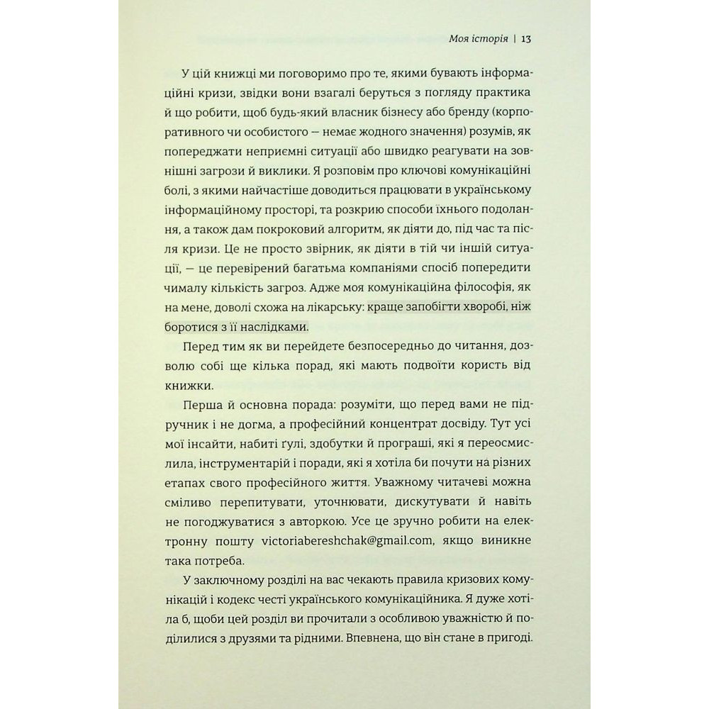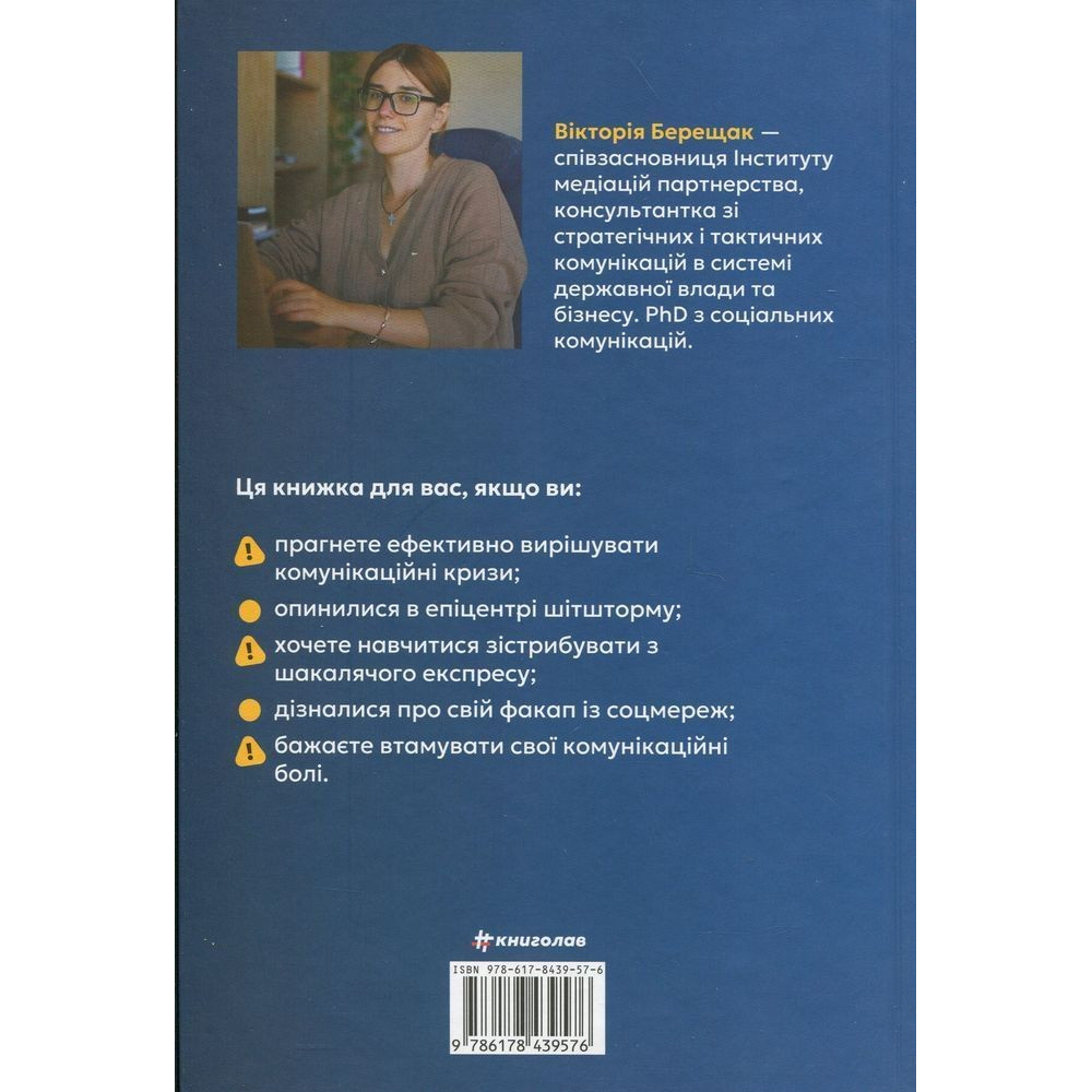 У книжці «Як здолати шторм. Золоті правила антикризових комунікацій» консультантка зі стратегічних та тактичних комунікацій, викладачка та письменниця Вікторія Берещак розповідає про ефективний менеджмент різноманітних кризових ситуацій, що можуть негативно впливати на репутацію компаній чи осіб, дає перевірені поради про те, як будувати продуктивні комунікації в інформаційному полі та в команді під час кризи, підтримувати імідж бізнесу та долати репутаційні виклики. Це не просто довідник, як діяти в тій чи іншій ситуації, — це чудовий спосіб попередити чималу кількість загроз для бренду.