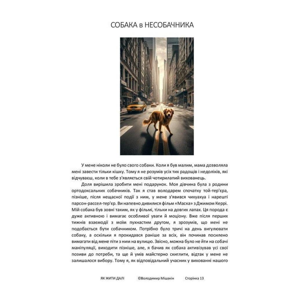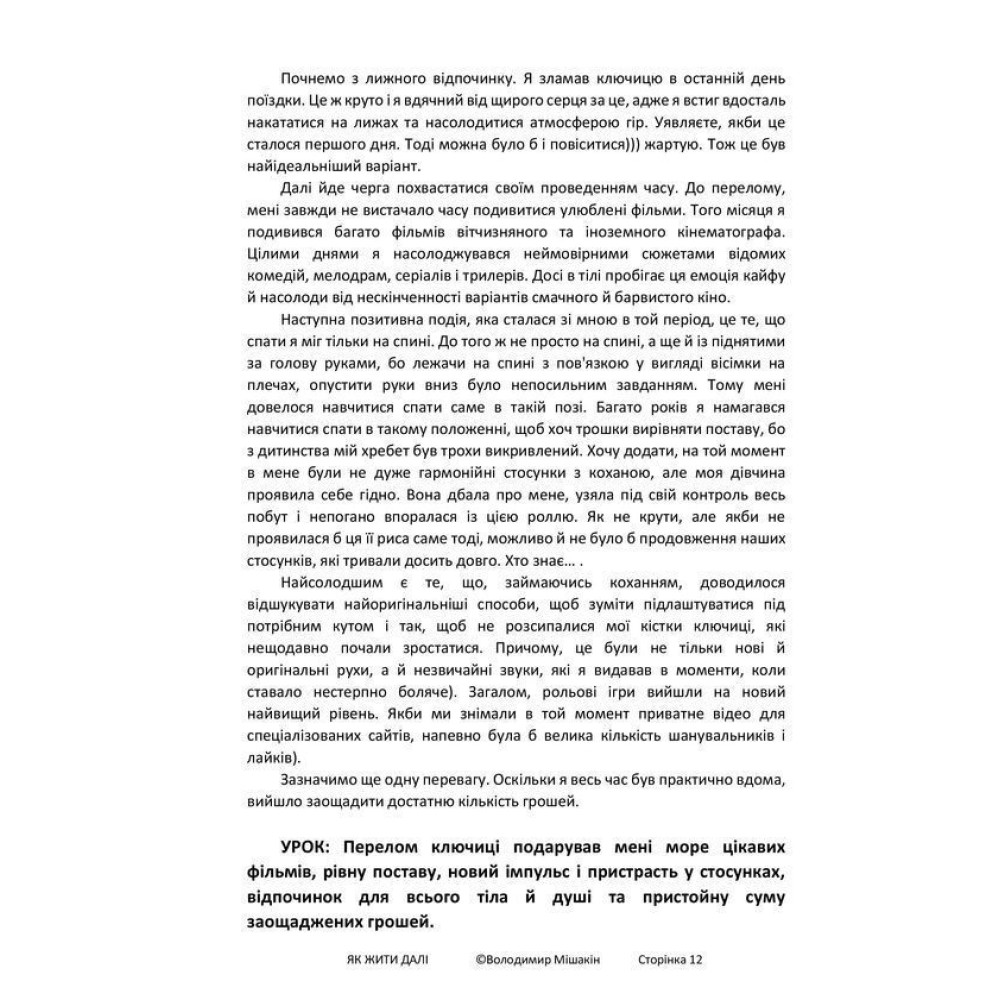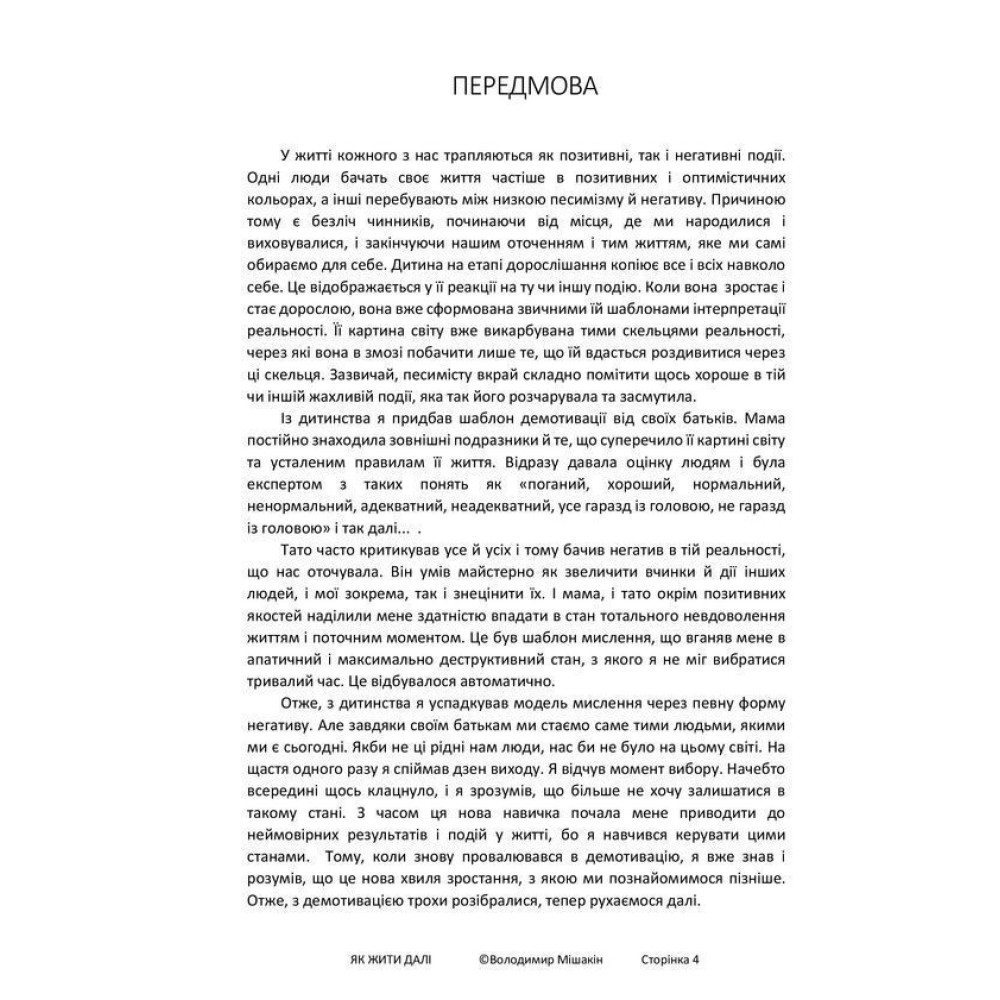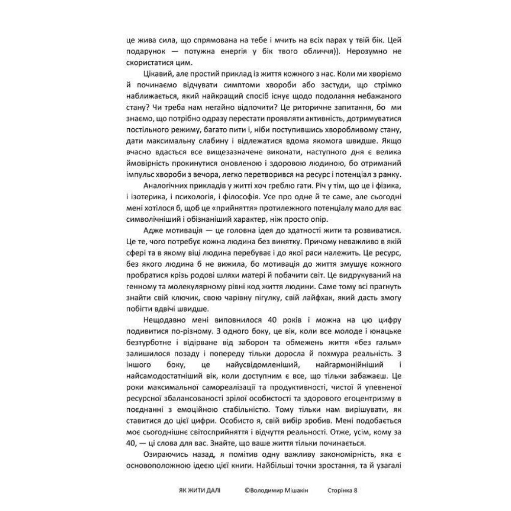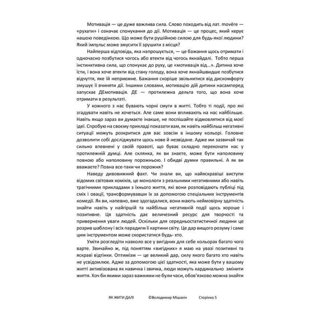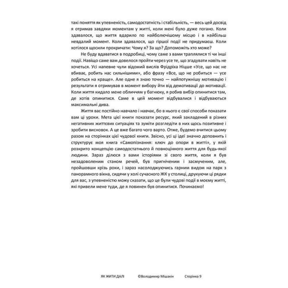 Володимир Мішакін у книзі «Як жити далі» за допомогою простих істин та більш свіжого погляду на старі речі підказує стосовно питання, яке кожен з нас часто собі ставить — «В чому сенс існування?», що в свою чергу зможе вивільнити нашу внутрішню енергію, яка глибоко схована всередині, та призвести до обов'язкового успіху.