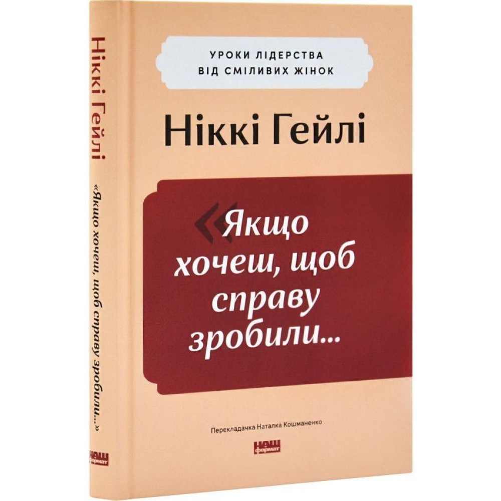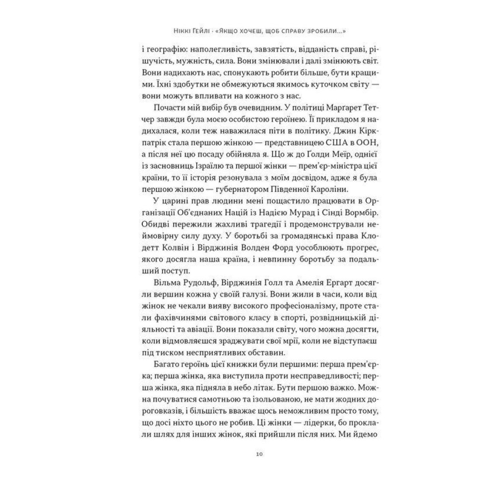 Що об’єднує прем’єрку, спортсменку, правозахисницю й шпигунку? Усім їм довелося діяти в умовах, які потребували надзусиль. І всі вони змінили світ. У своїй книжці «„Якщо хочеш, щоб справу зробили...“. Уроки лідерства від сміливих жінок» Ніккі Гейлі, яка сама пройшла шлях від чужинки і «занадто молодої» до представниці США в ООН і кандидатки в президенти, ділиться десятьма історіями жінок, чия рішучість переписувала історію.