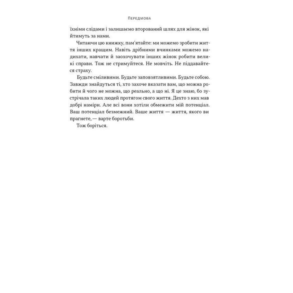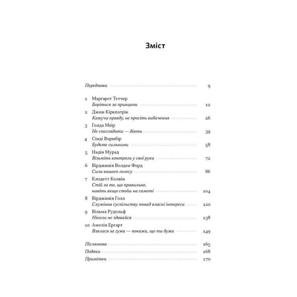 Кожен розділ — це урок лідерства, викристалізований з досвіду конкретної жінки. Тетчер учить боротися за принципи, Мурад — бути сильнішою за болісний досвід (навіть якщо це сексуальне рабство у ХХІ столітті), Ергарт — доводити свою силу в небі, а Колвін — стояти, чи то пак сидіти, за те, що правильно.