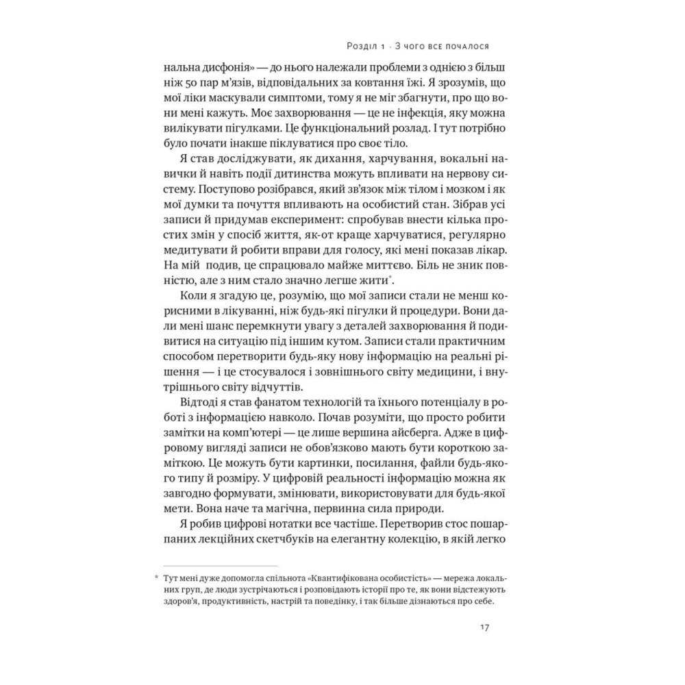 Це можливо з концепцією «запасного мозку» — так Тьяґо Форте називає систематизовані нотатки, цифровий архів ваших найцінніших спогадів, ідей і знань. Саме вони допомагають працювати, керувати бізнесом, планувати та водночас не тримати в голові кожної дрібниці. У книзі «Запасний мозок. Як організувати цифрове життя і розвантажити голову» він не тільки пропонує концепцію, а й показує, як завдяки їй буквально змінити життя.