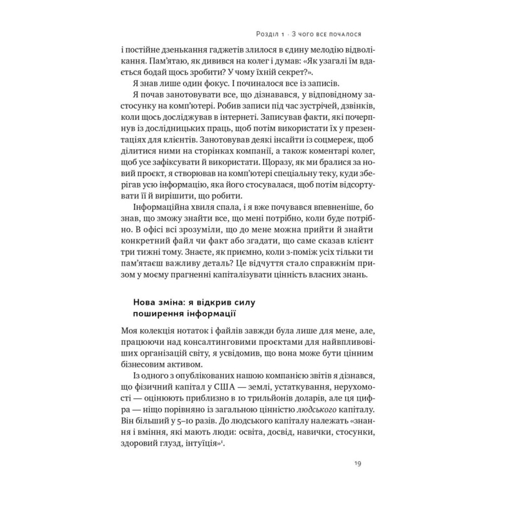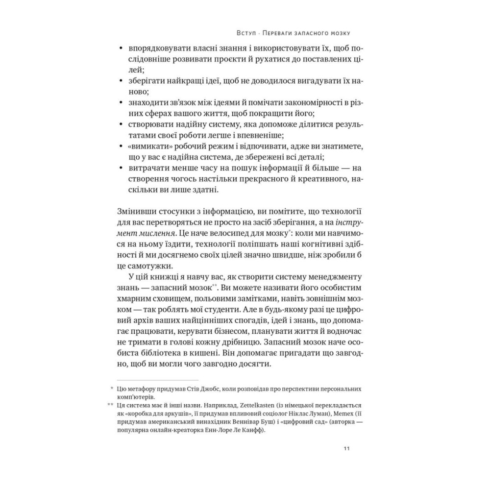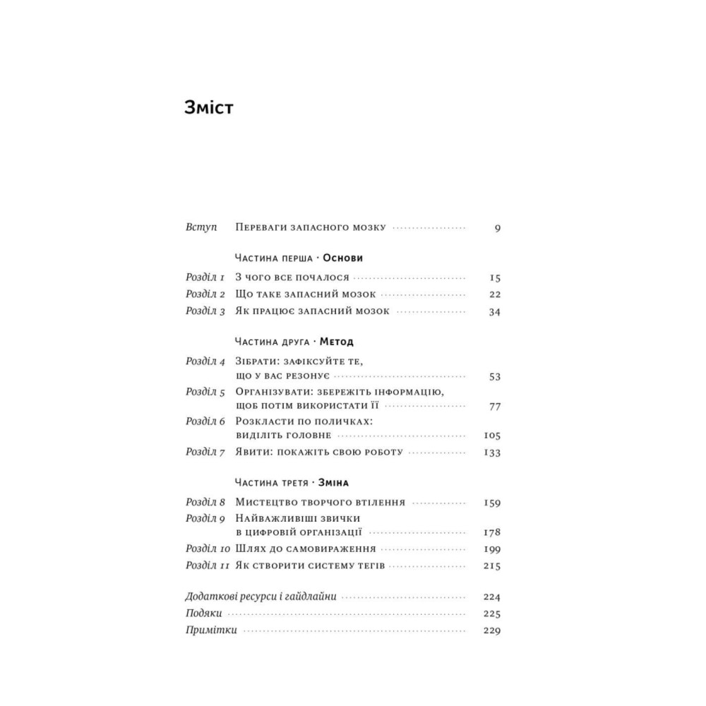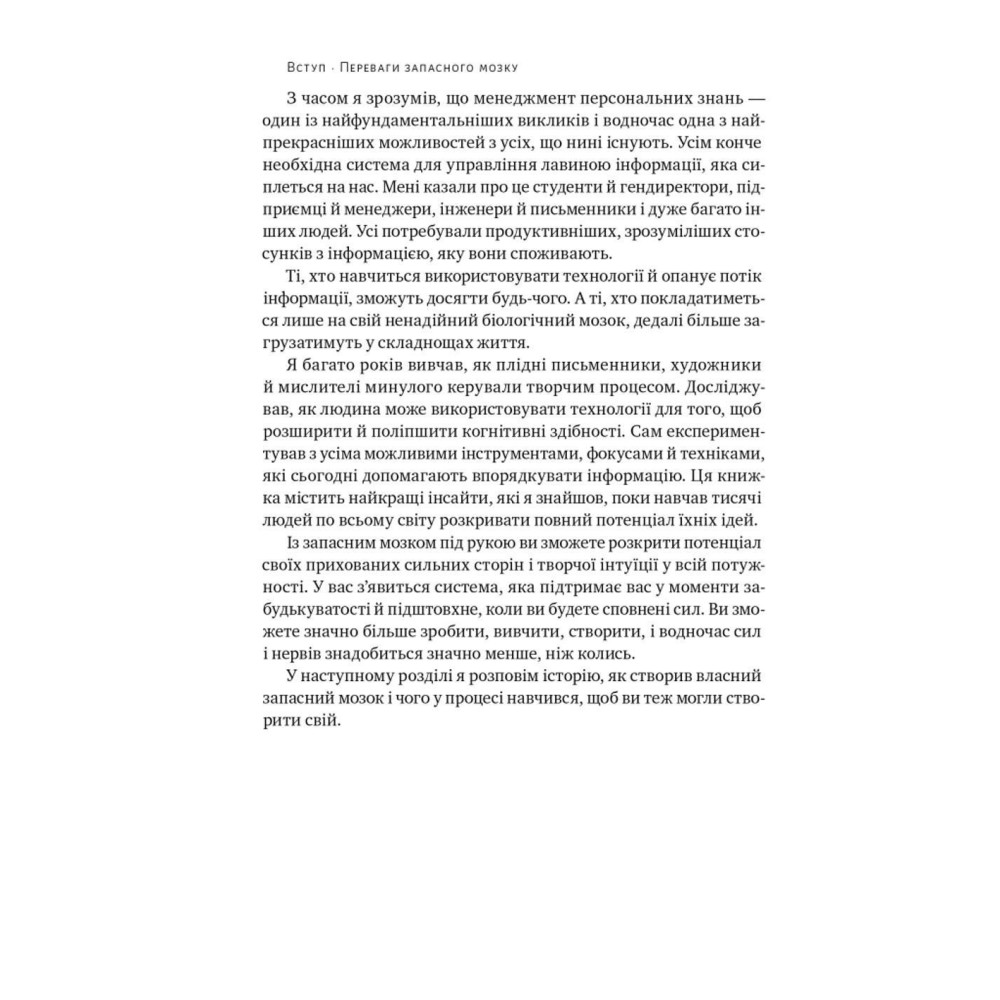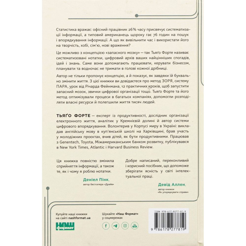 Із цієї книжки ви довідаєтеся про метод ЗОРЯ, систему ПАРА, урок від Річарда Фейнмана, 12 практичних кроків, щоб запустити запасний мозок, звички цифрової організації тощо. Тьяґо Форте та його метод оптимізували процеси в багатьох компаніях, допомогли розподіляти власні ресурси й полегшили життя тисяч людей.